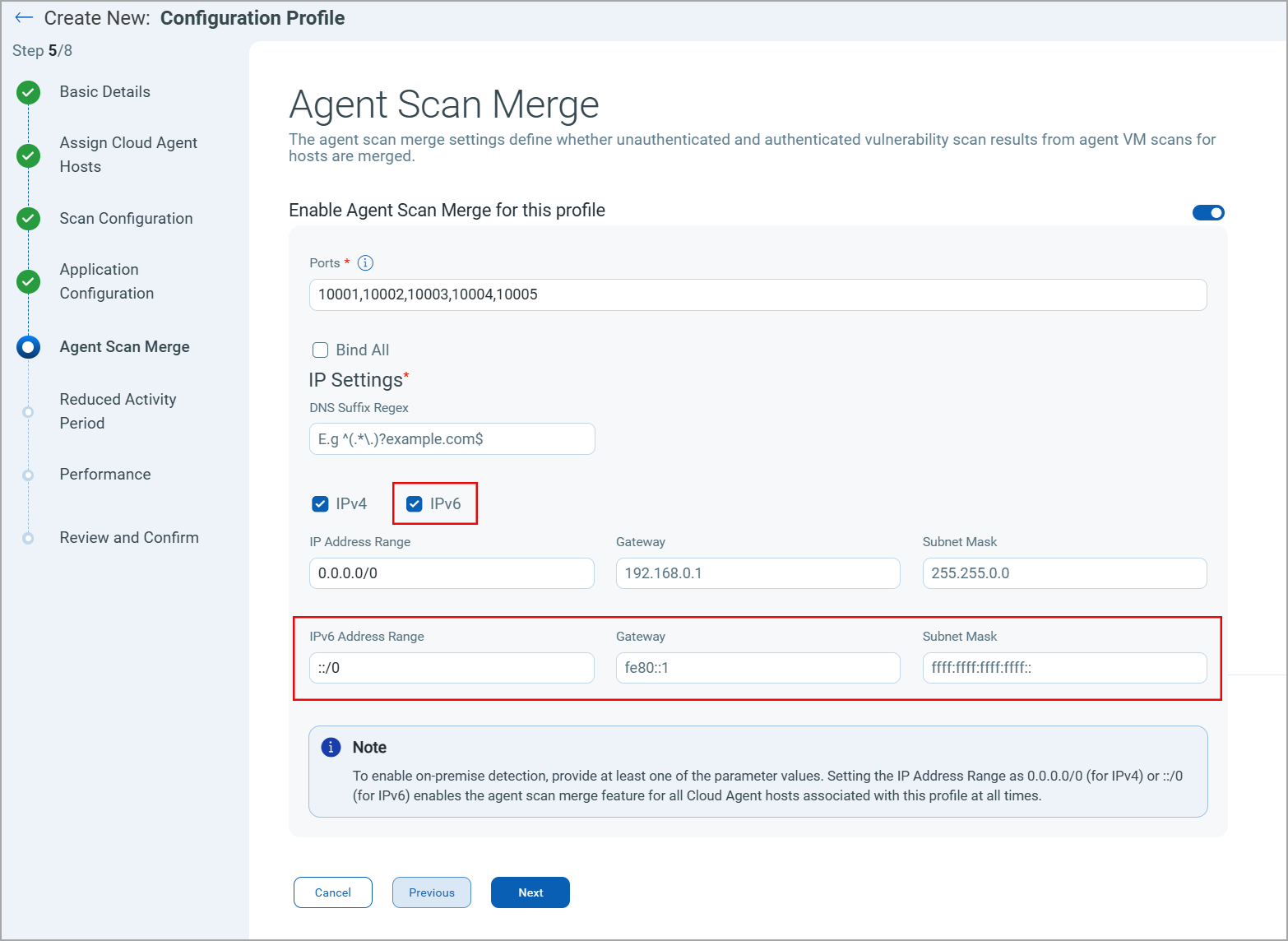 Cloud Agent for Windows 6.2 and later versions support both IPv4 and IPv6 assets for on-premise detection. This includes, IP Address Range, Gateway, Subnet Mask, and DNS Suffix.