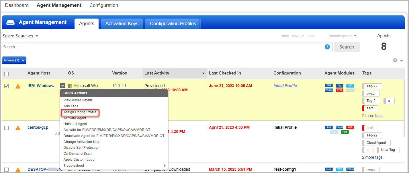 - From the list of agent hosts, select an agent host and select Assign Config Profile from the Quick Actions menu.