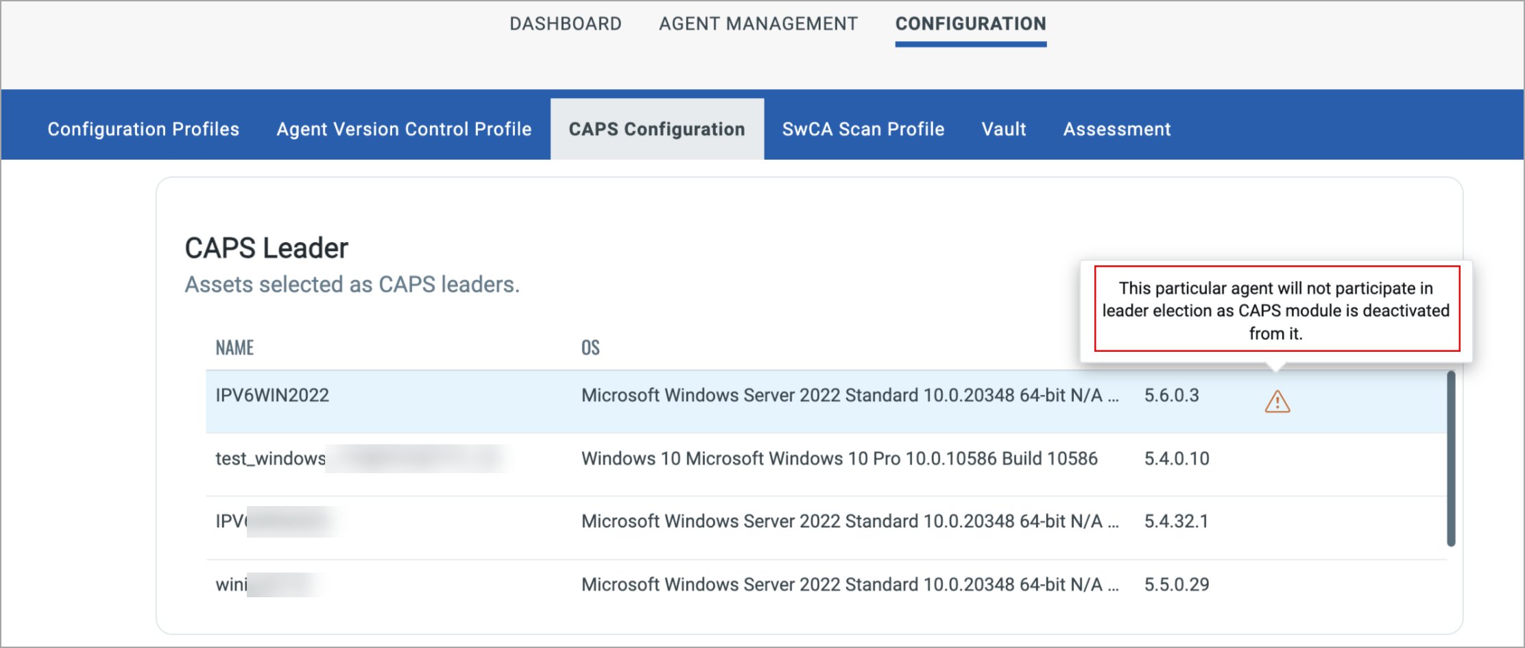 Only the host assets that have a CAPS-activated Cloud Agent installed can participate in the CAPS leader election. The host assets do not participate in CAPS leader election if the associated Cloud Agent is not activated for CAPS or deleted from the host asset.