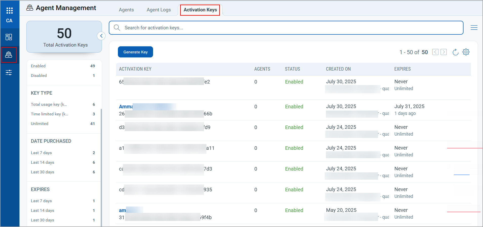 - Expired Keys: When the specified usage limit for an activation key is reached, it is marked as Expired. The expired activation key cannot be used for onboarding new Cloud Agents, but the Cloud Agents that are installed using an expired key continue to function as expected.
