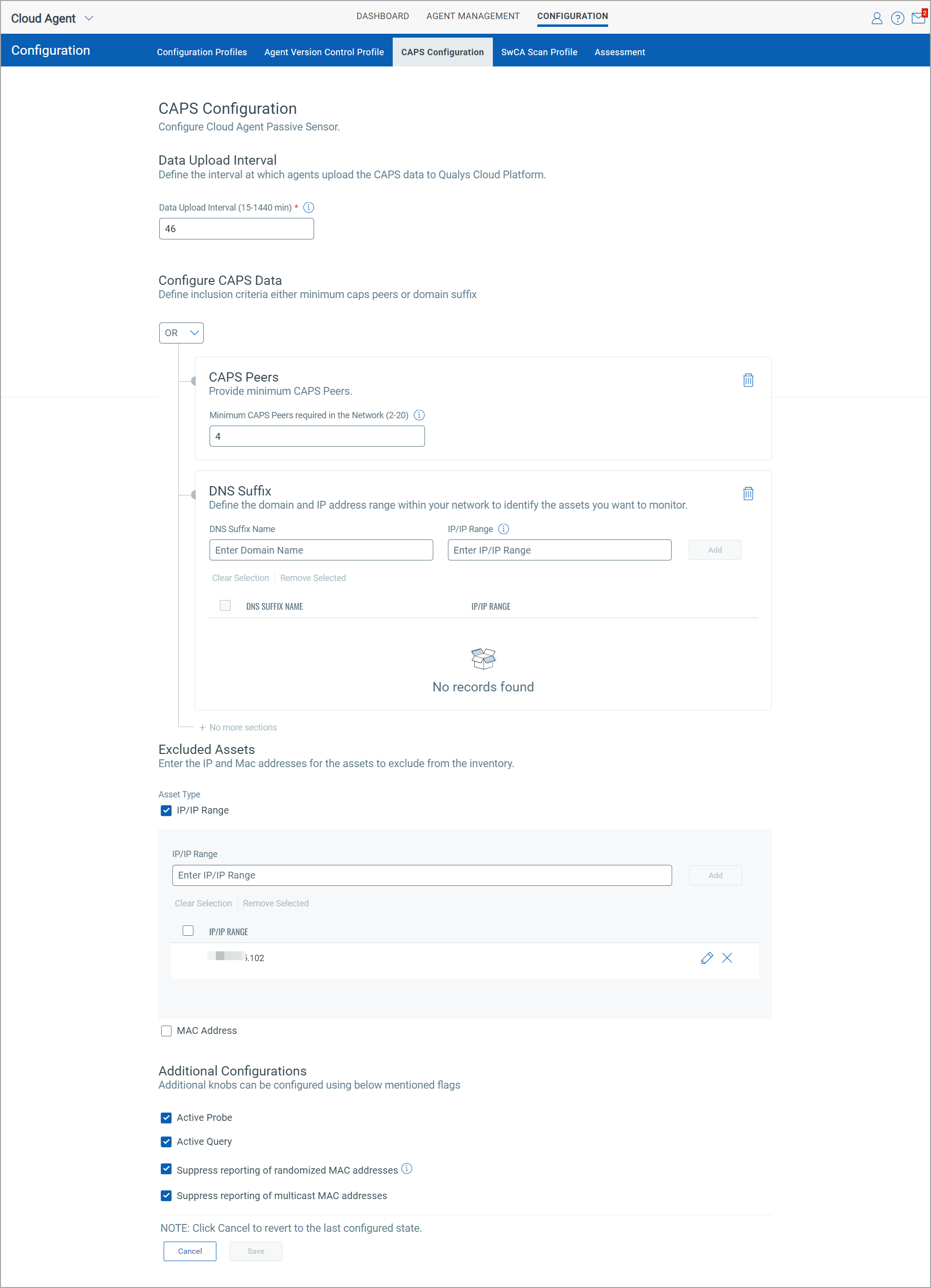 When you set the value for CAPS Peers with IP address and do not provide the DNS Suffix name, the AND condition is applied for CAPS peers and DNS suffix. This means that for a Cloud Agent to start the scan, both the minimum peer condition and IP address condition must be fulfilled in your network.