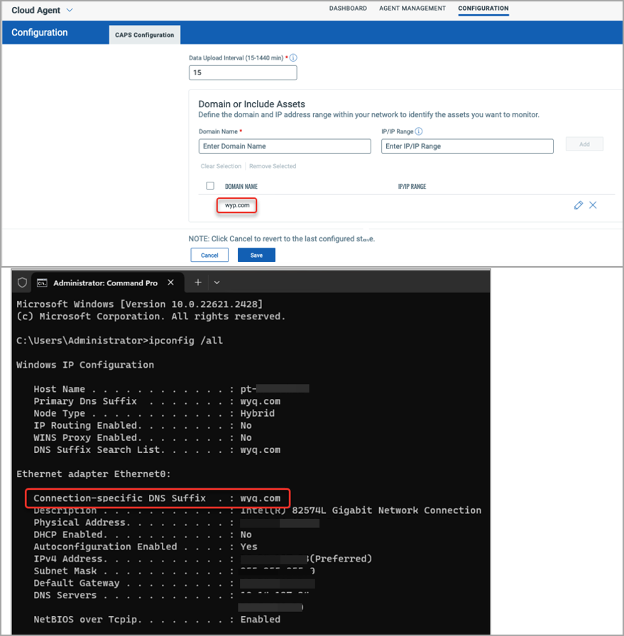DNS Suffix Name: Provide the domain name(s) for the assets that you want to include in the asset inventory. CAPS leader ensures that the assets present in the subnet of the Agent interfaces, whose DNS Suffix matches the configured domain names are reported.