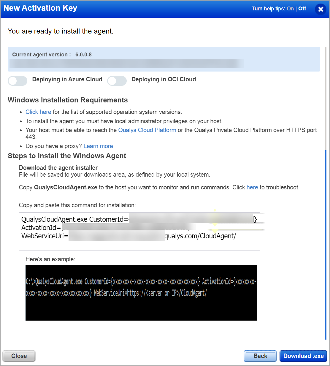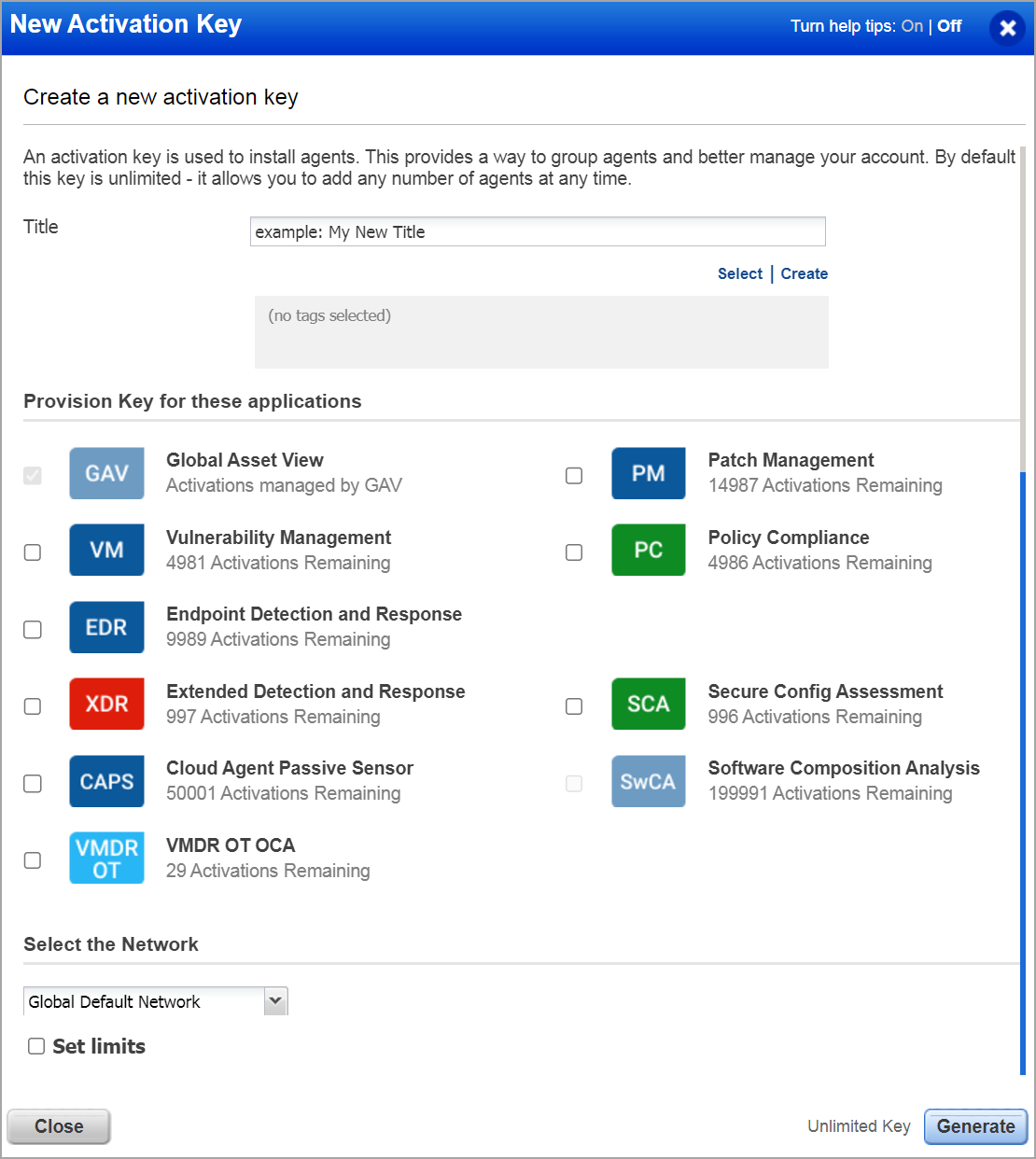- Click Generate to see the Activation Key and Cloud Agent packages for various platforms.