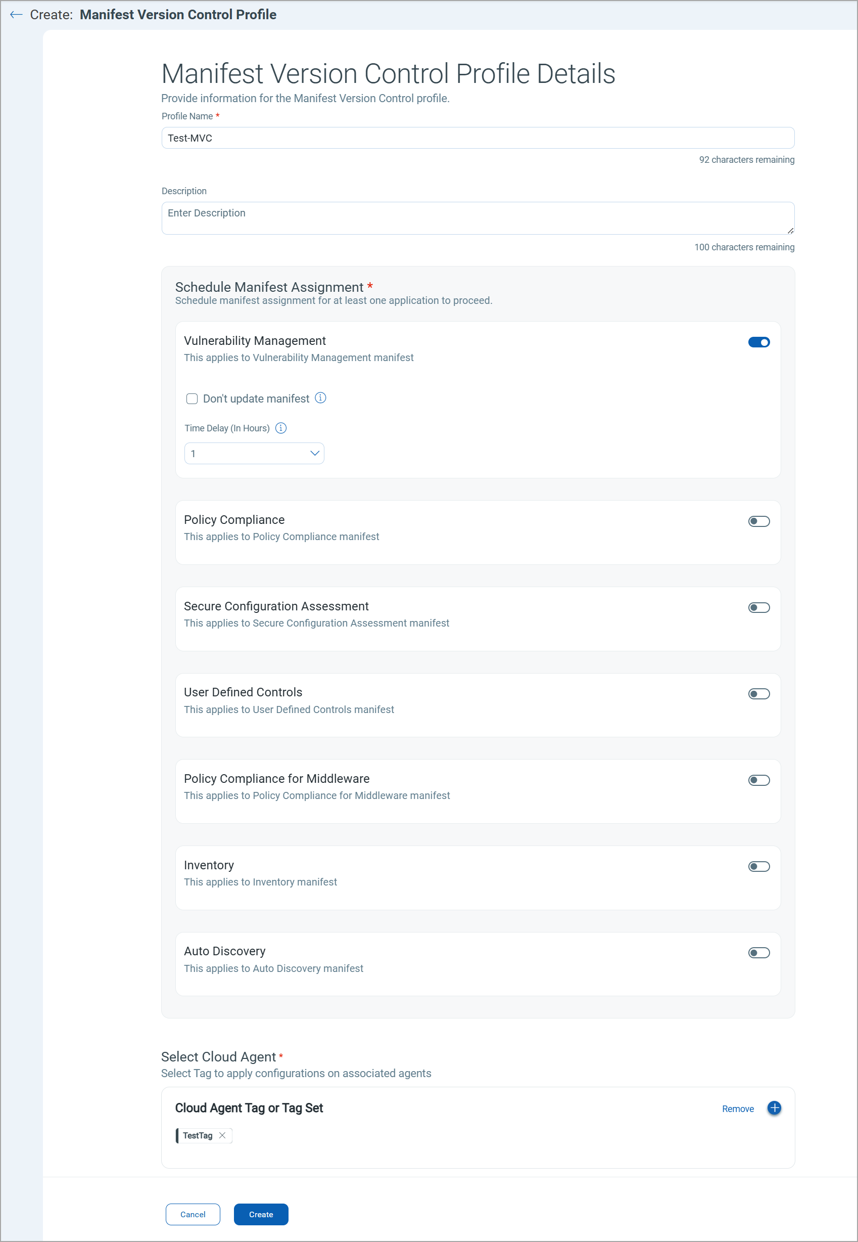 In the Time Delay field, select the time interval in hours to delay the new manifest assignment for your Cloud Agent. By default, the Time Delay is set to 0 hours. Meaning, Cloud Agents are assigned the new manifest immediately after it is published. You can set a maximum of 48 hours of time delay for the manifest assignment.