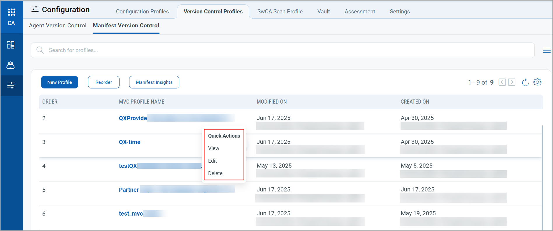 You can use the Quick Actions menu to View, Edit, or Delete a manifest version control profile.