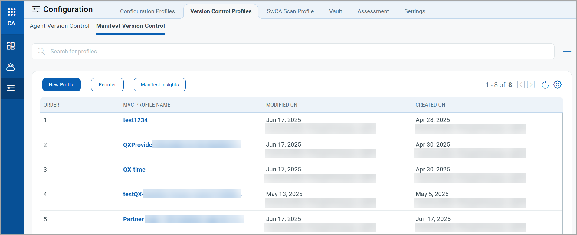 - Navigate to Configurations > Version Control Profiles > Manifest Version Control tab in the Cloud Agent user interface.