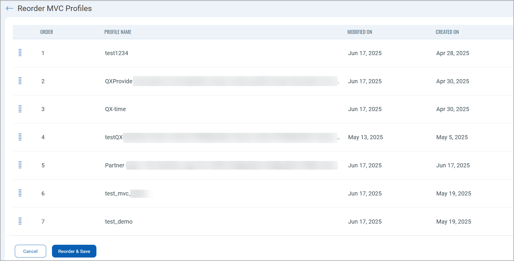 The MVC profiles are assigned based on their priority. To change the profile priority, click Reorder in the Manifest Version Control tab and reorder the profiles in the Reorder MVC Profile window.