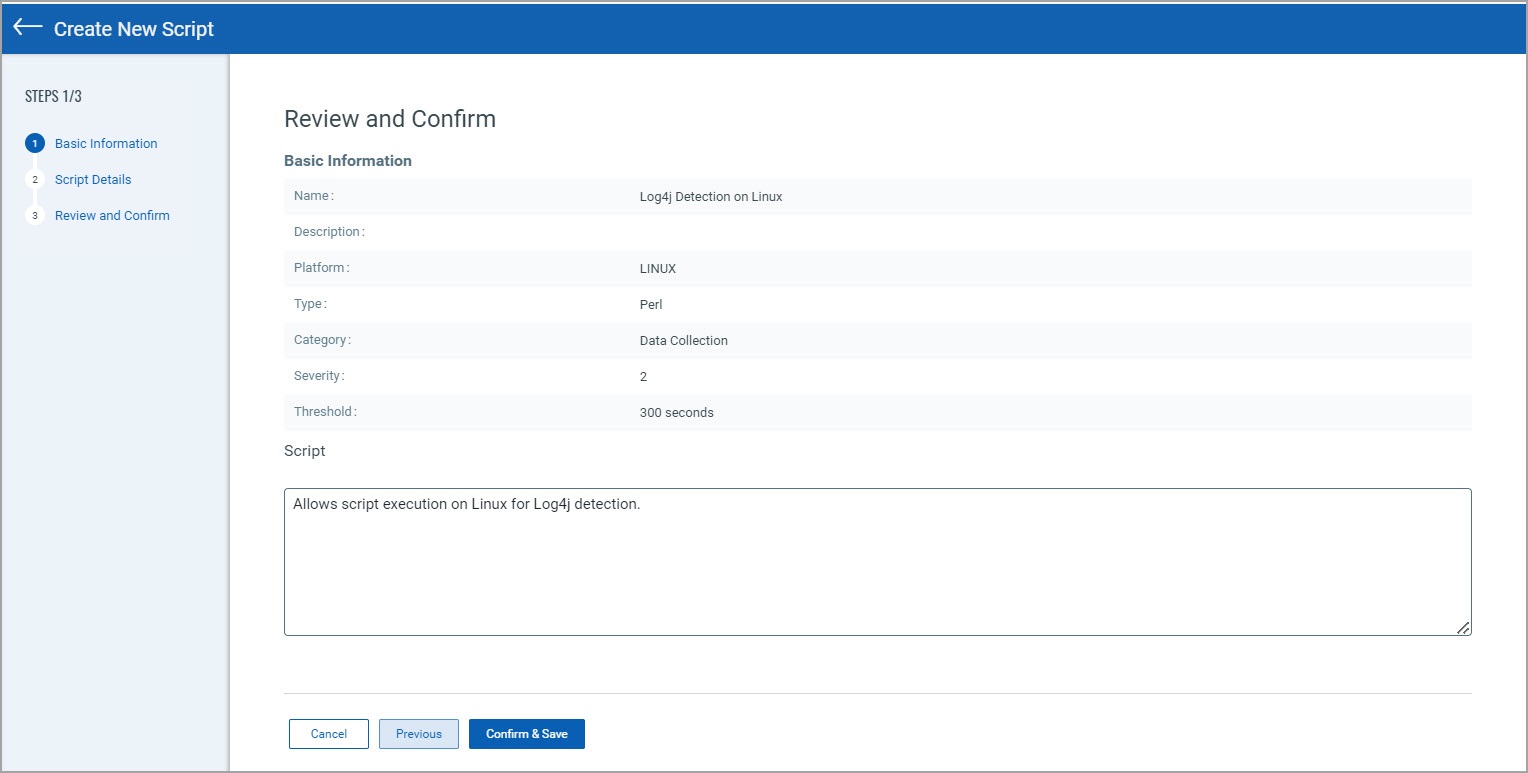 9. In the Review and Confirm page, review the information and then click Confirm & Save to create the script. The newly created script will be listed on the Script tab.