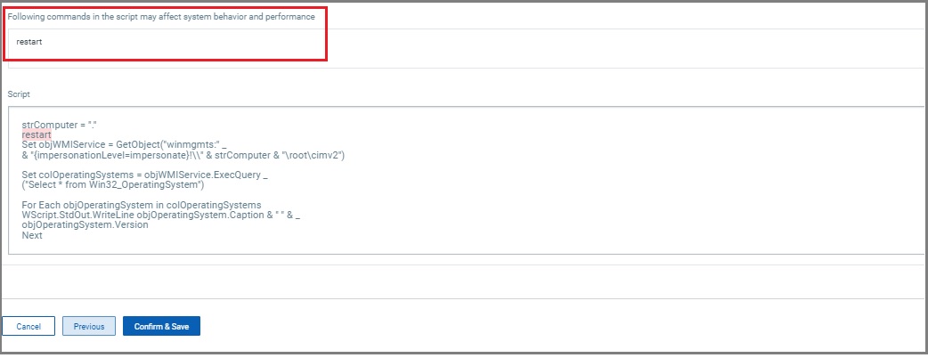 3. The Review and Confirm page displays the selections you have made for the script. It also highlights if the script you have entered contains any commands that may potentially impact the system behavior and performance.