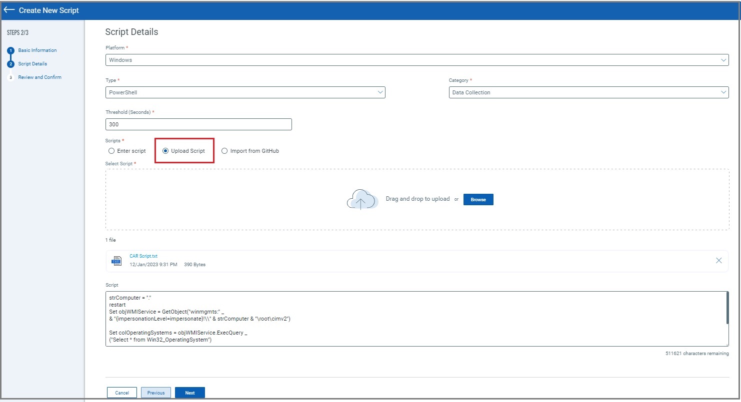 You can upload a script from your local drive. The script size limit for any asset on both Windows and Linux platforms is 500 KB.