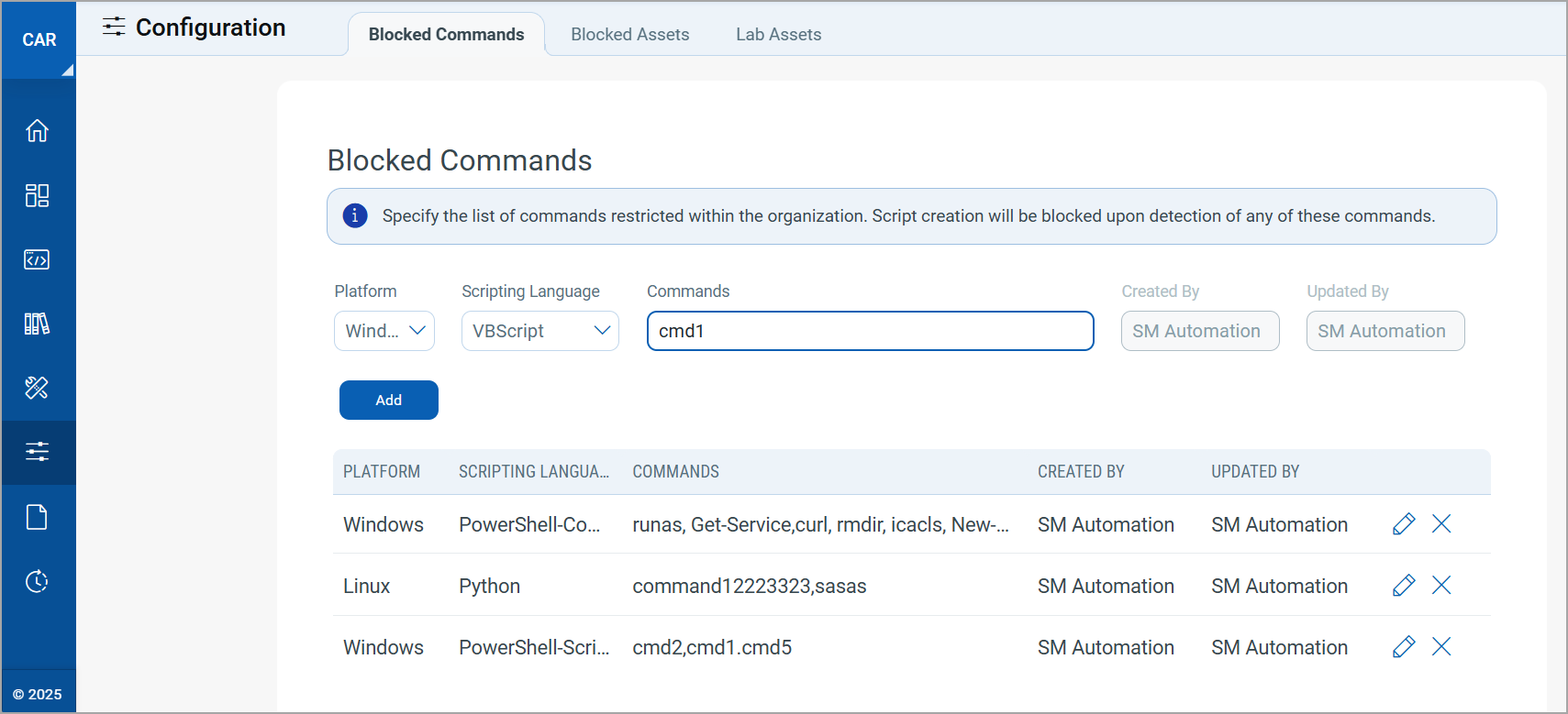 In Blocked Commands, you can add the list of commands that you want to block from running on the script. You can also view who created and updated each blocked command.