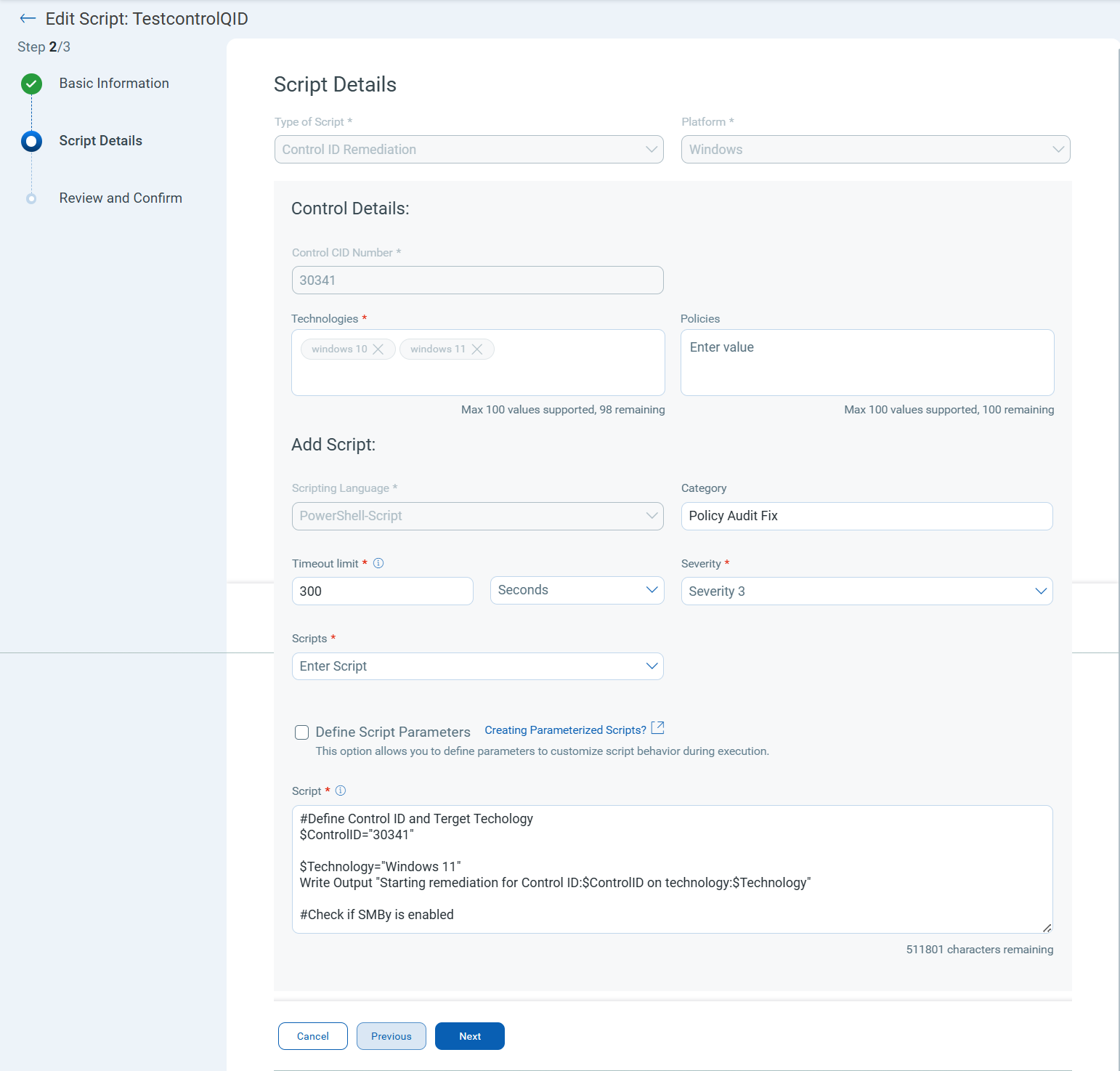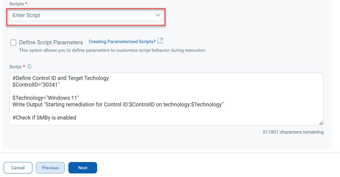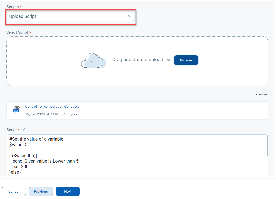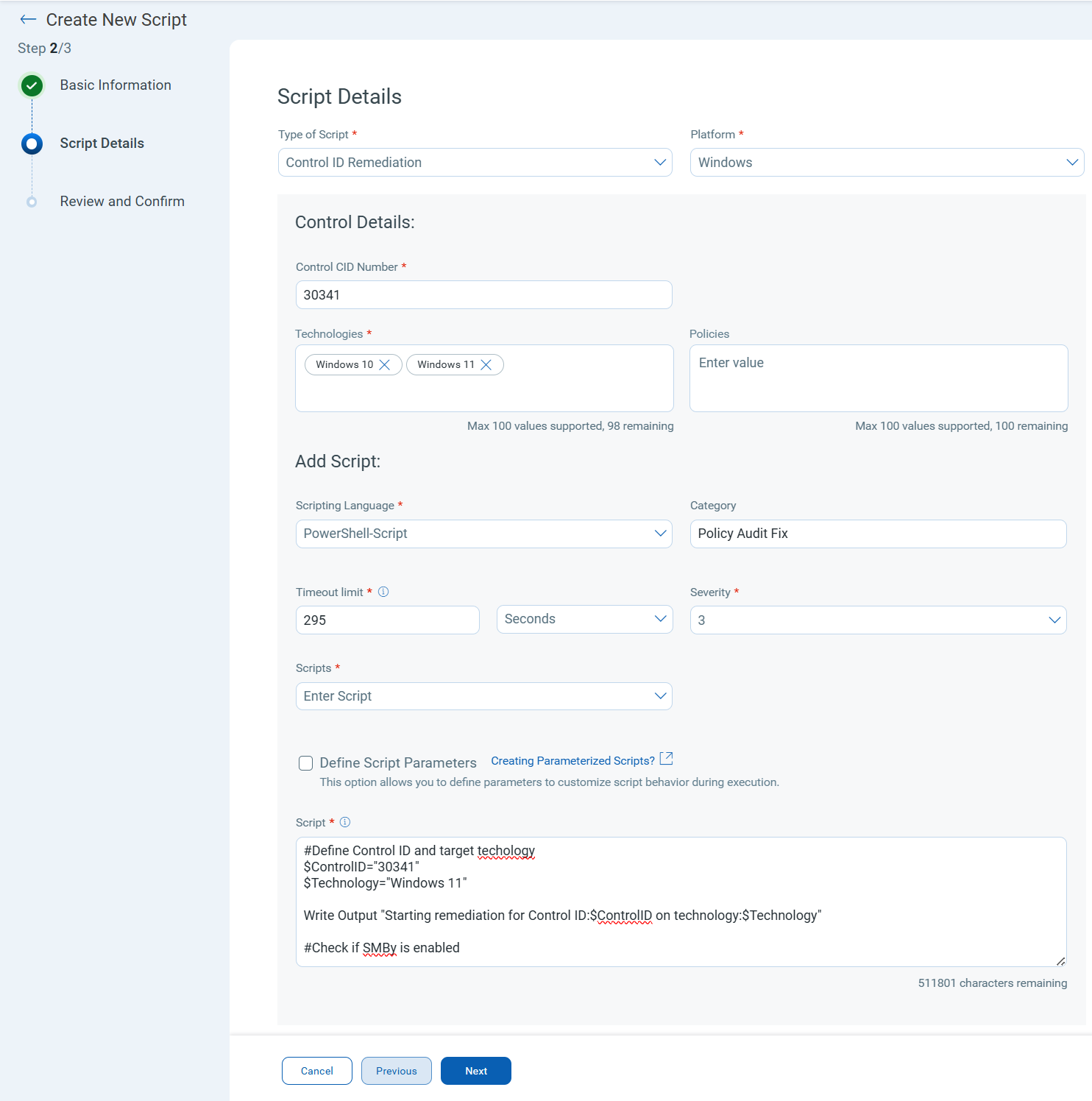 Type of Script Select Control ID Remediation from the options listed. Control CID Number Enter the control ID number. Technologies Enter the technologies associated with the control ID. Policies Enter the policies associated with the control ID. Scripting Language Select a required Scripting Language from the list. The Scripting Language options change as per the selected platform. If you have selected the Windows platform, the following languages are displayed: