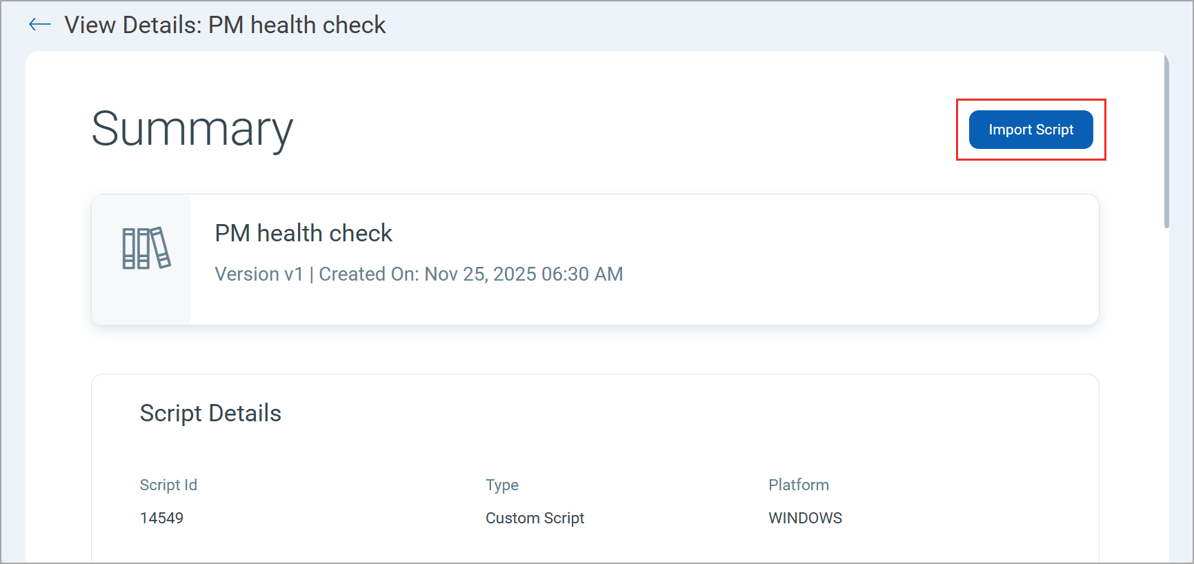 You can also import the script from the script summary page by clicking View Details > Import Script.