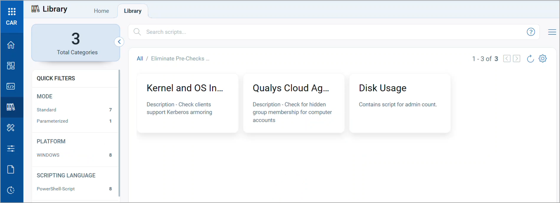 If the module is expired or disabled for the subscription, the scripts related to that application are grayed out in the Library tab in CAR UI and cannot be imported into the Scripts tab.