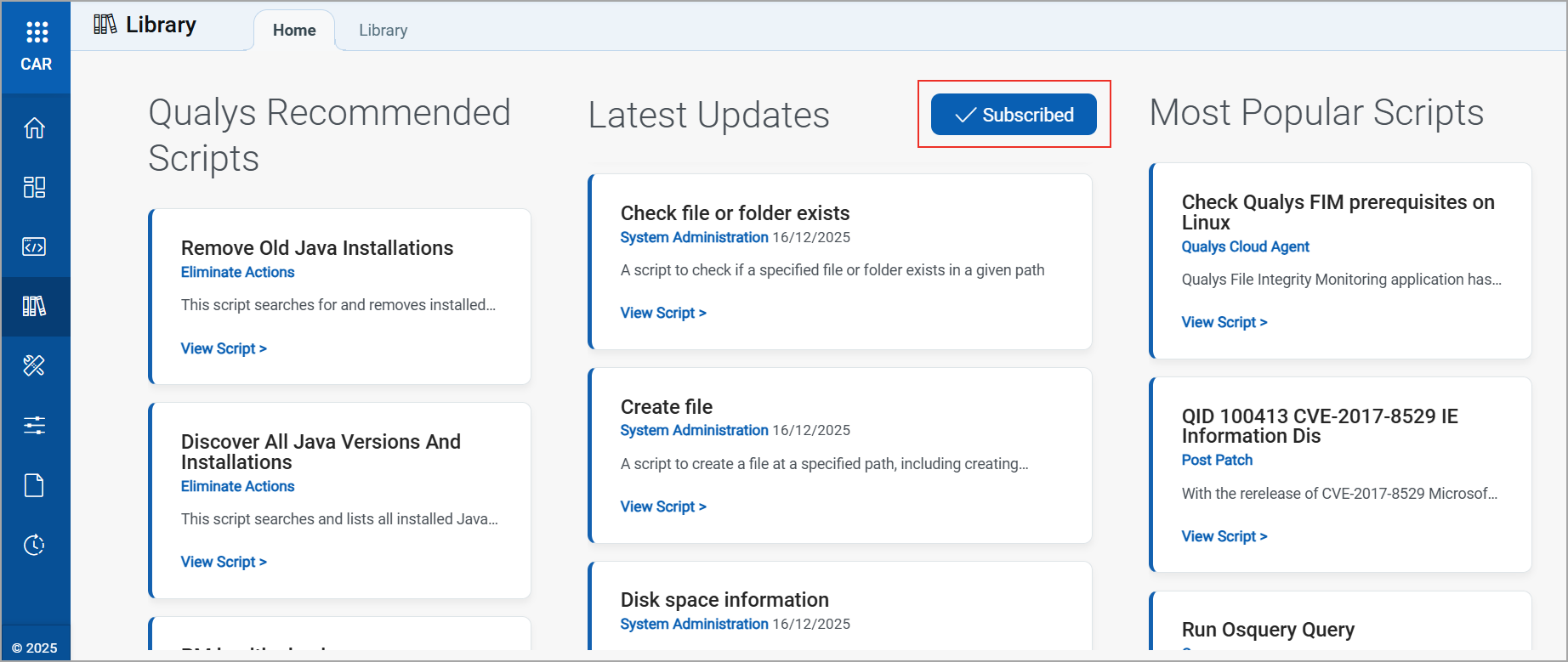With CAR Library, Qualys has introduced a secure and centralized way to import the script from the library in the Scripts tab and execute it on different assets. The library scripts are organized into different categories and sub-categories according to the specific actions they perform or the outcomes they are intended to achieve. You can navigate around the library using the navigation path.
