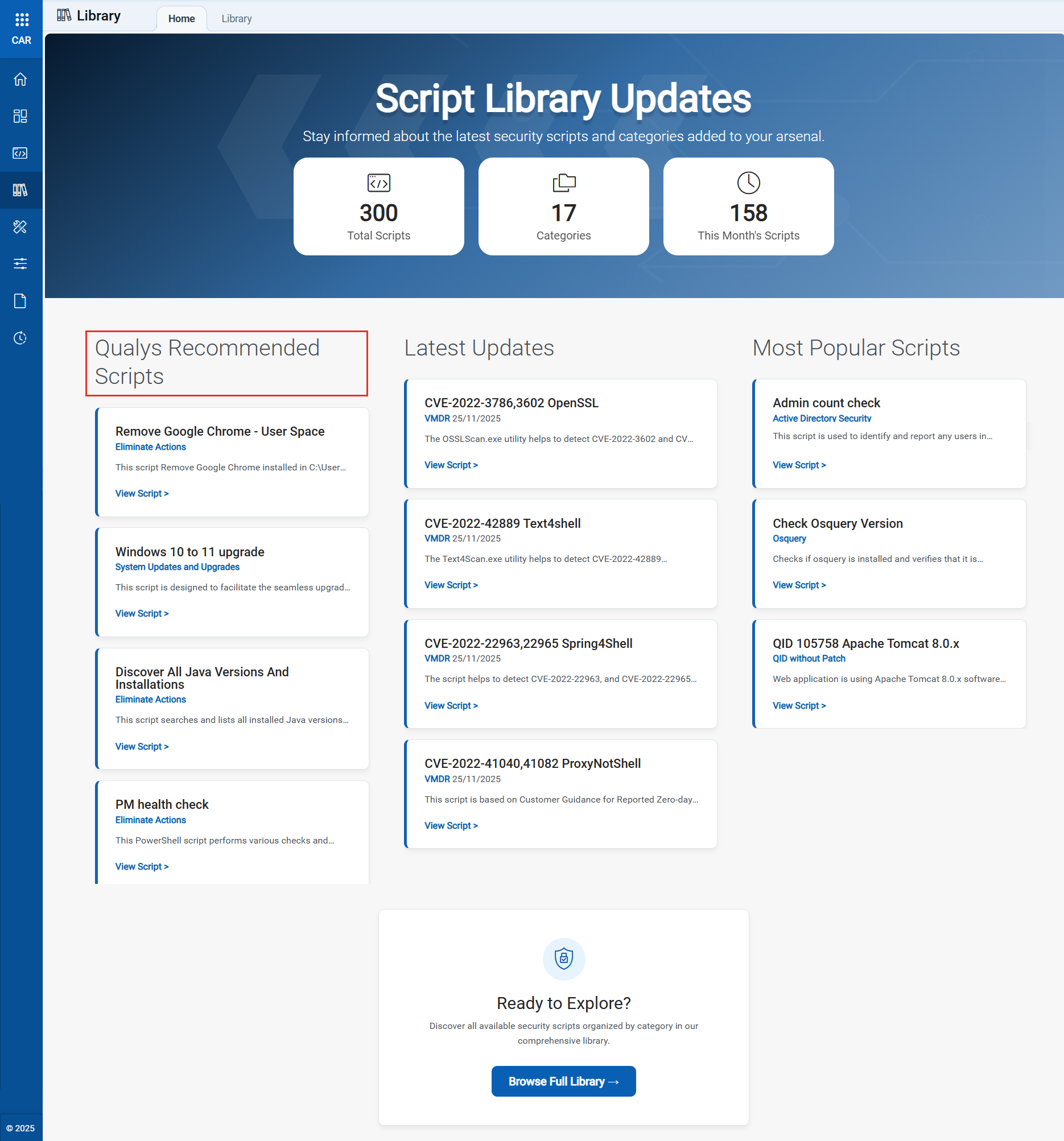 You can now view a curated list of Qualys-recommended scripts on the Library > Home tab. These scripts are specifically selected to address complex vulnerabilities, including residual Chrome files, leftover Java components, Windows build upgrade requirements, and more.