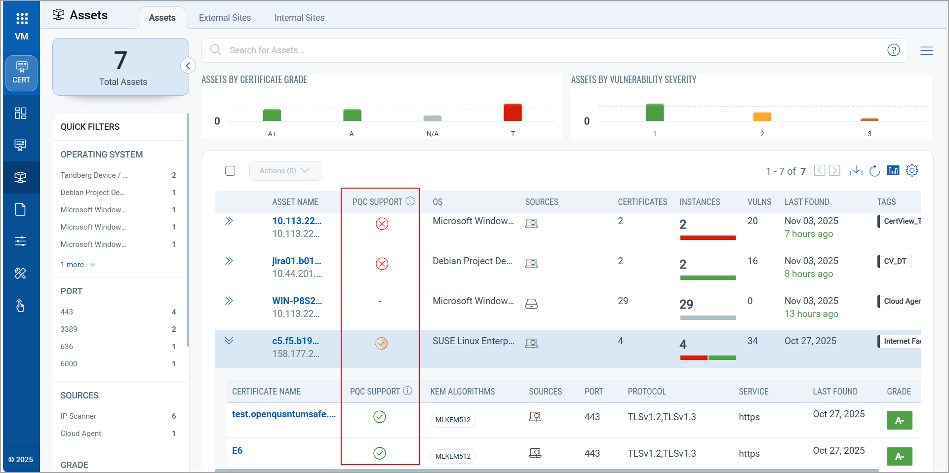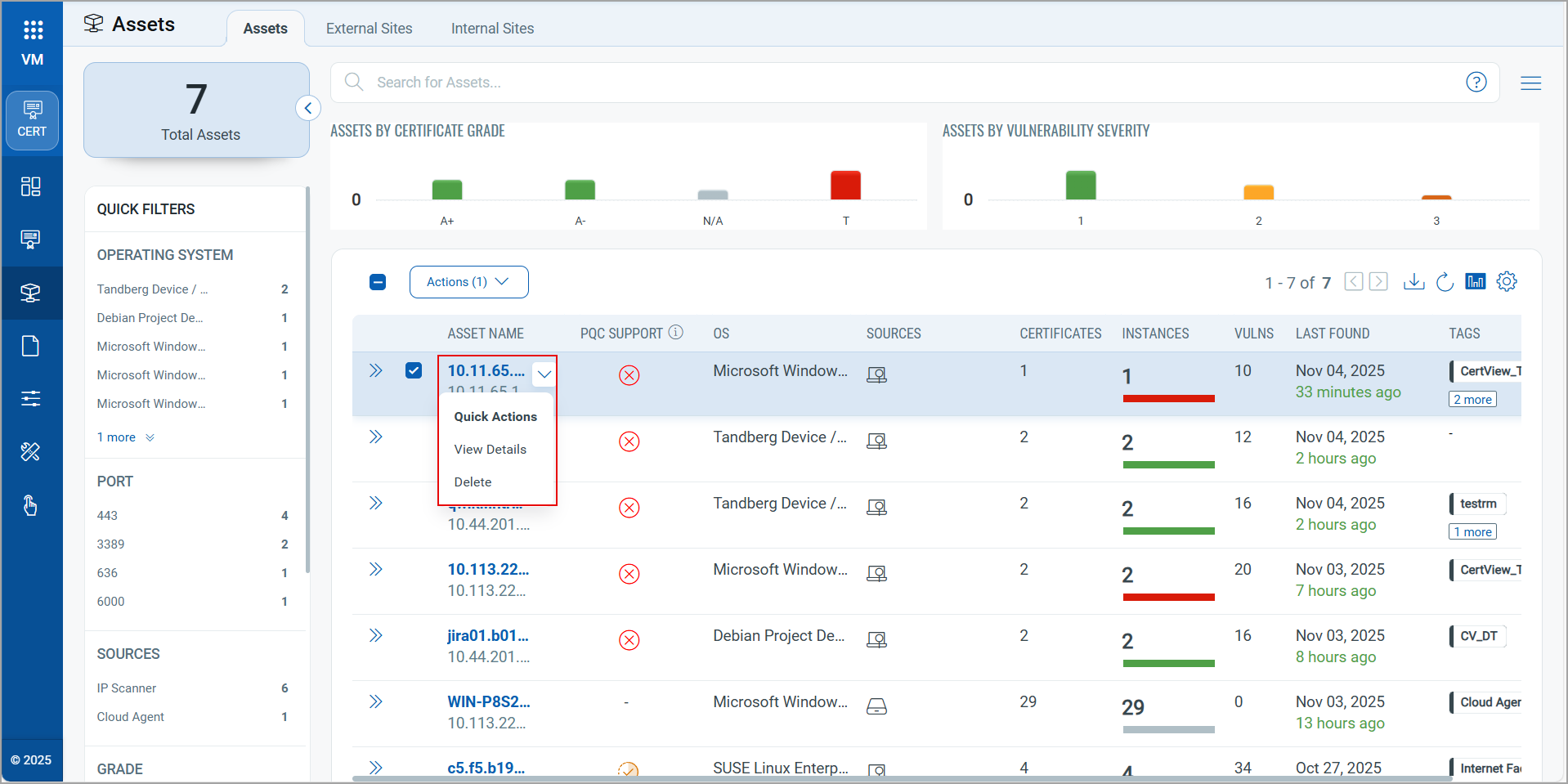 The Assets tab lists all assets. You can view details, such as OS, Sources, ports, vulnerability, certificates, and installed software of the assets on which the certificates were discovered.