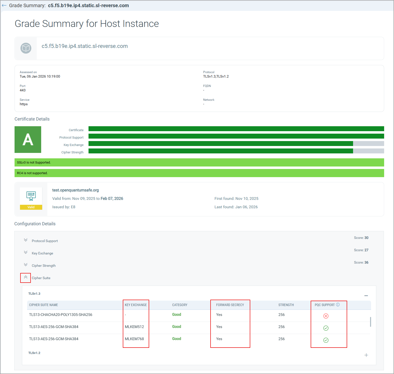 Here, in the Cipher Suite details, you can view the supported Key Exchange Algorithms, and PQC Support, indicating whether the cipher suite is PQC-supported (true or false), along with the other details such as Cipher Suite Name, Category, Strength, and Forward Secrecy support for each cipher suite (Yes or No), indicating whether the Cipher Suite provides forward secrecy, ensuring the session keys remain secure even if the private key is exposed.