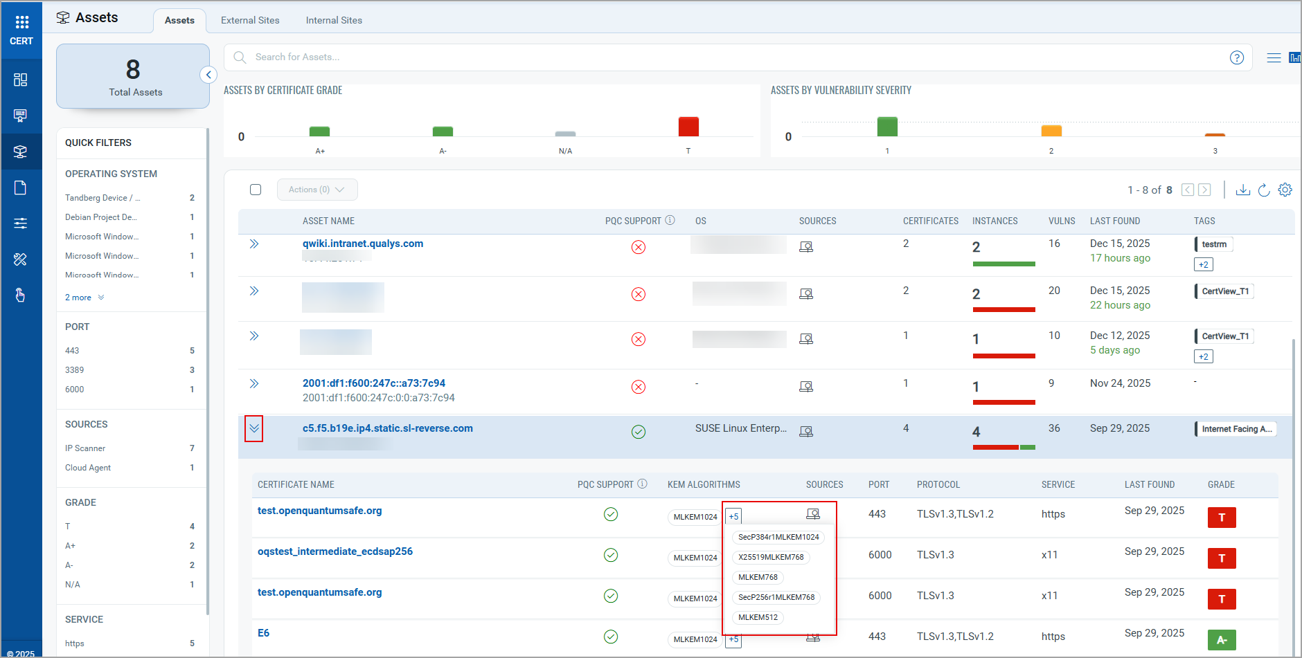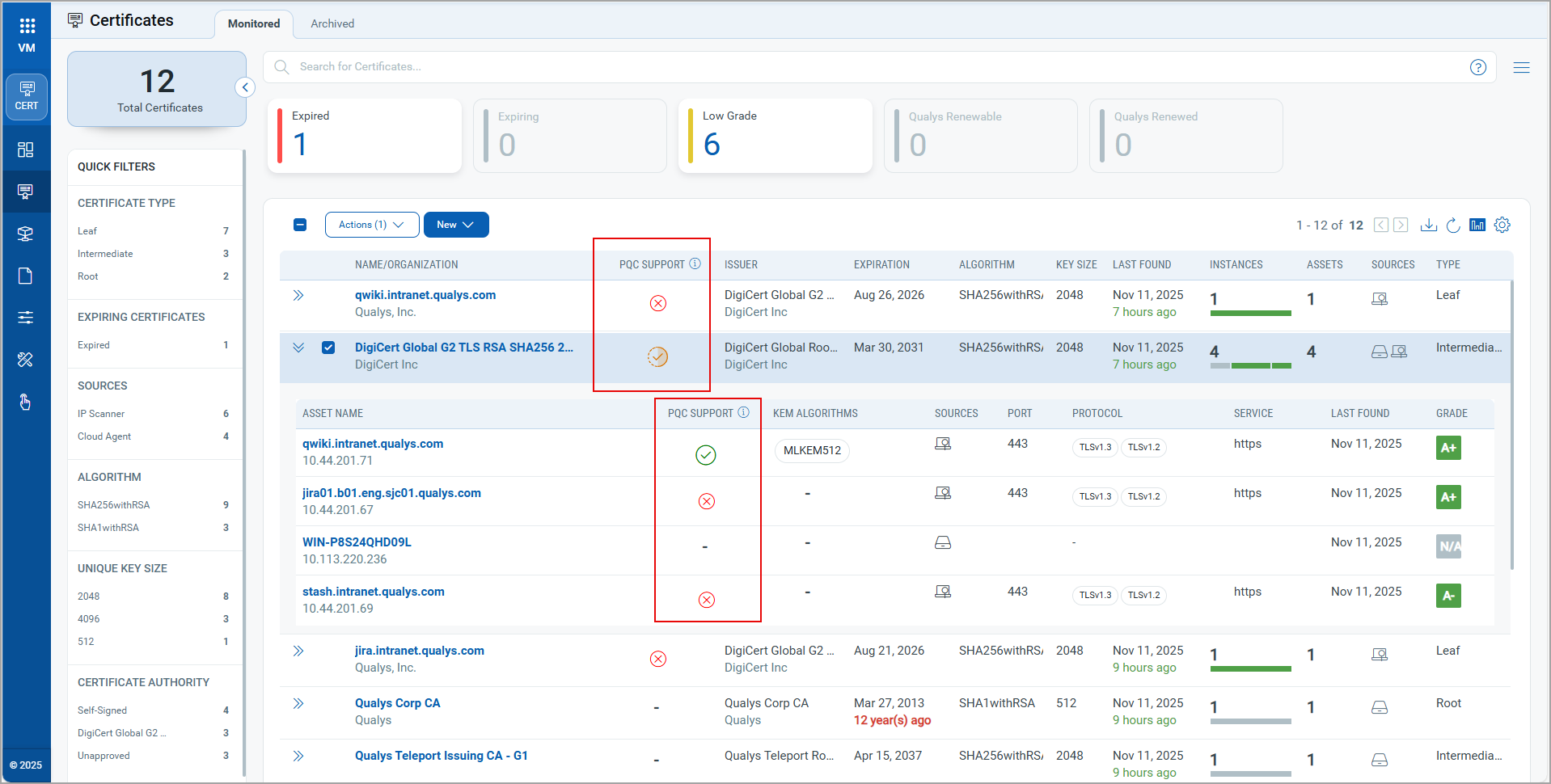 The PQC support status is displayed for each asset.
