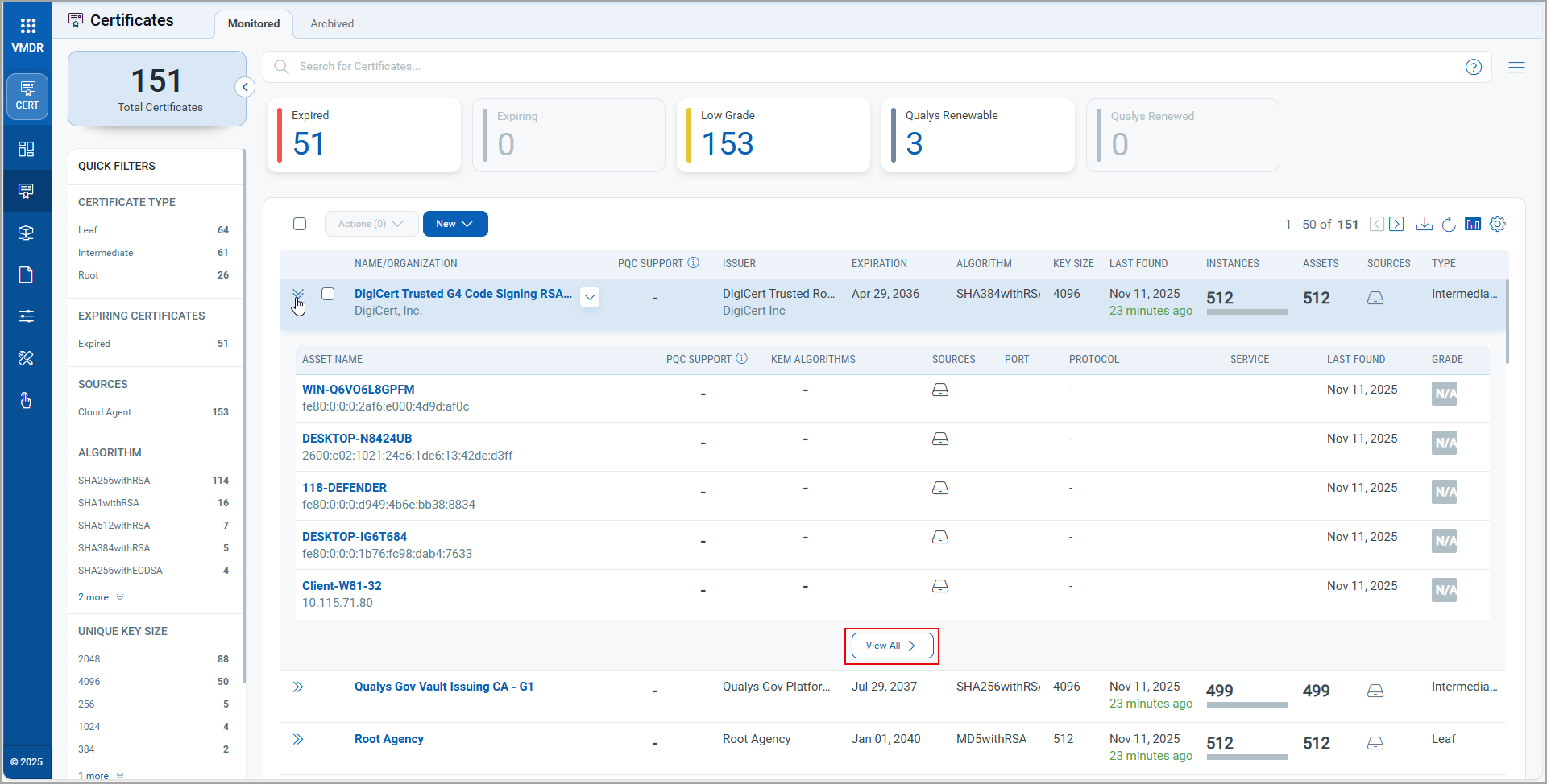 option to view the listed assets under that particular certificate. If a certificate has more than five associated assets, you can click View All to navigate to the Assets tab and access the complete details.