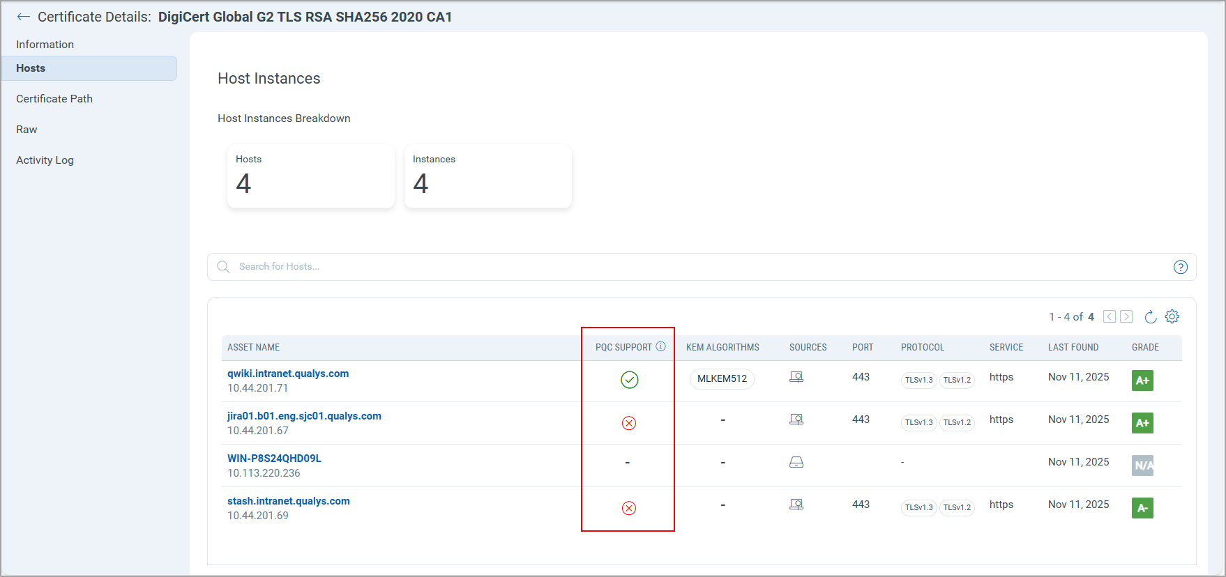 You can view the details such as the asset name, PQC support status, supporting OS, PQC-supported algorithms used, host instances, grades, and certificate path of certificates discovered on your assets.