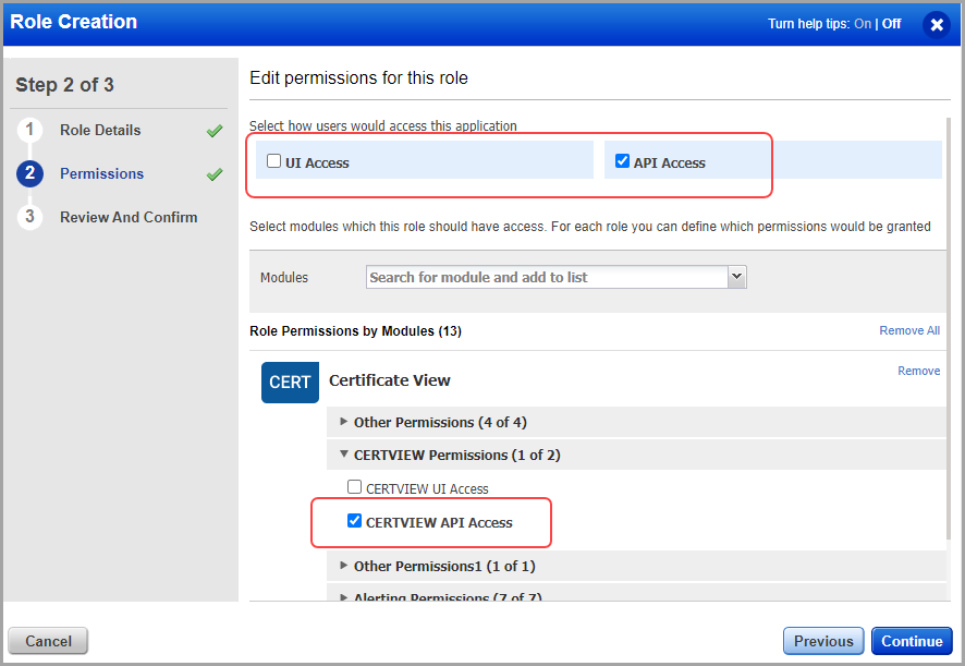 Select CERTVIEW API Access from CERTVIEW Permissions and verify the details on Review And Confirm tab and click Finish.