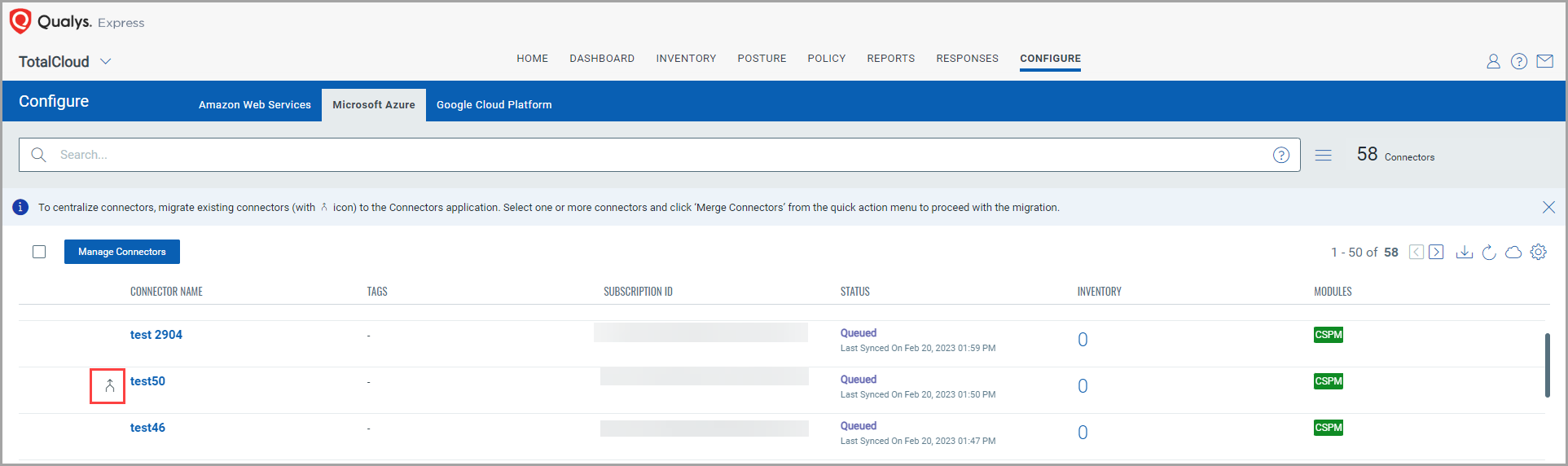 Configure Azure connectors for gathering resource information from your Azure account. The connectors are created on the Connectors application. You can merge your existing CSPM connectors or create a new one on the app.