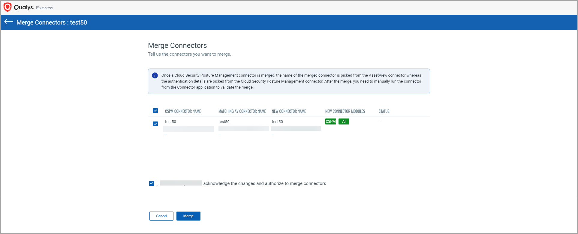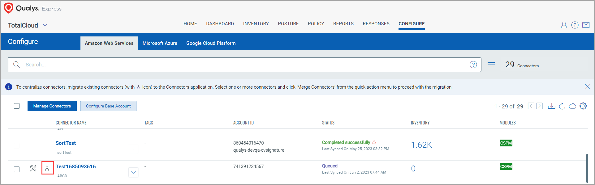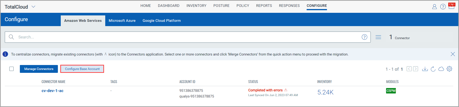 If CSPM and AssetView use different base accounts, you must merge them into the application of your choice. All new and existing connectors take the newly merged base account.
