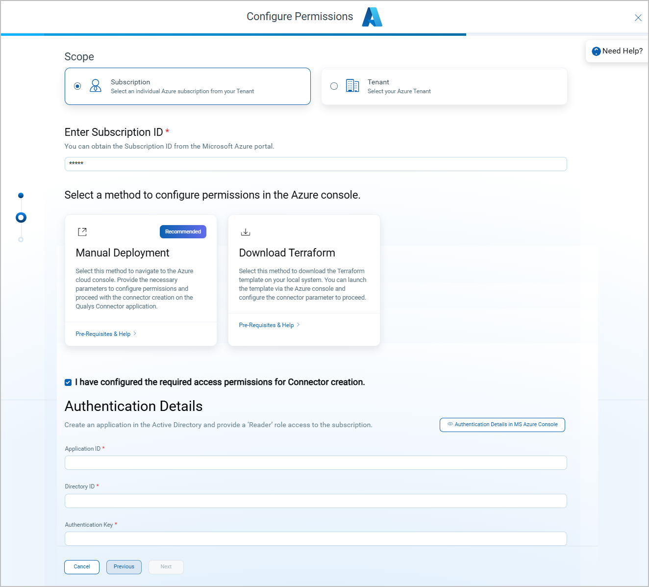 For the subscription-level connector, we offer two simple and powerful means of configuring your cloud provider's necessary permissions.