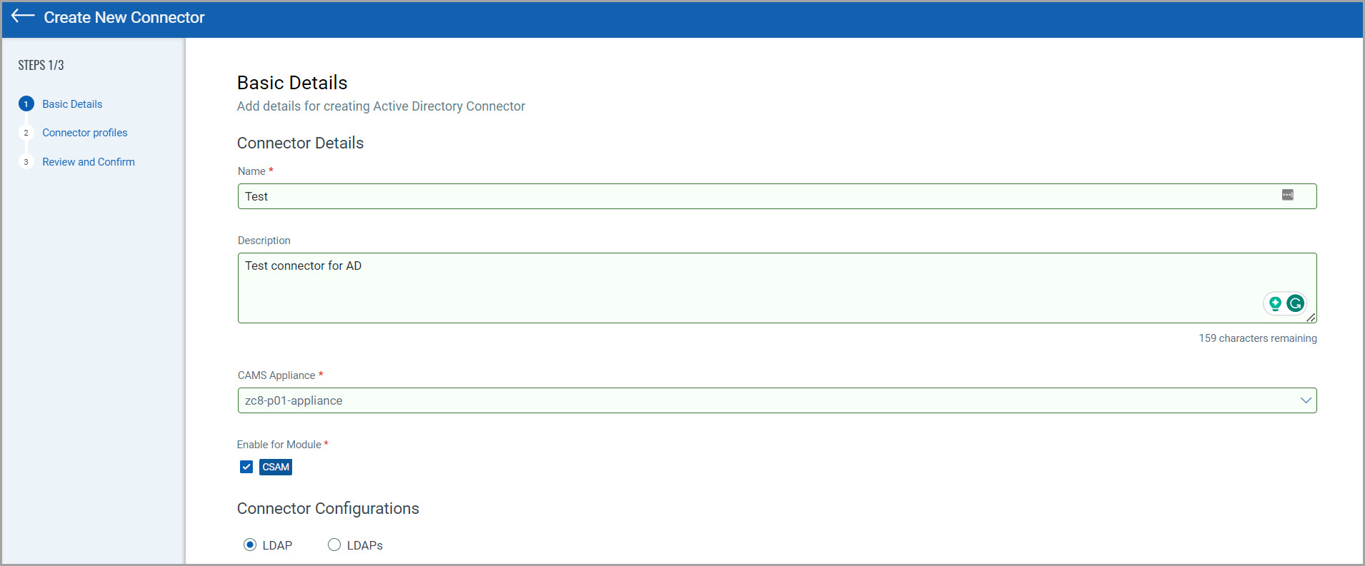 Connector Configurations – Provide the AD server configurations for the connector to establish a connection.