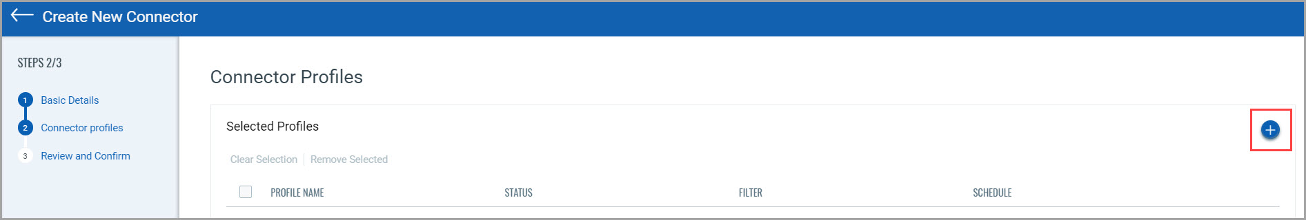 1. In the Connector Profile screen, click on the + icon to provide the required details: