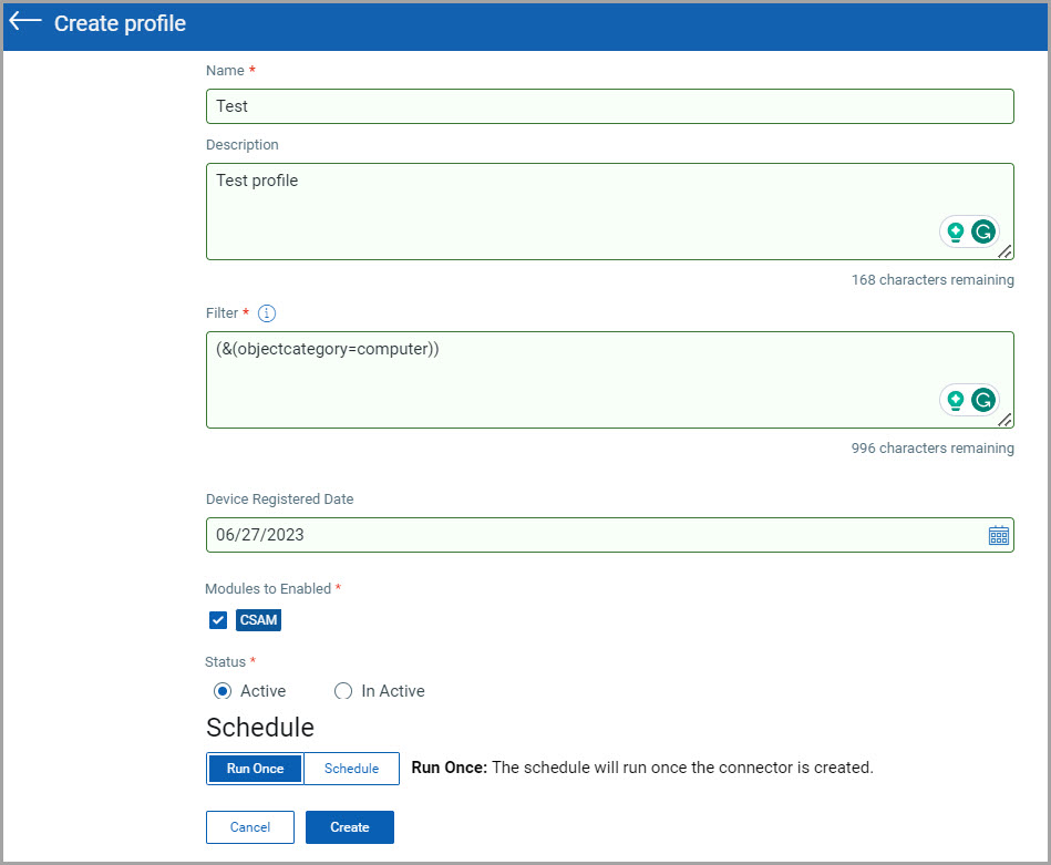 - Run Once - After configuring the profile, the connector fetches asset data from Active Directory and published it to CSAM (within 10 mins).