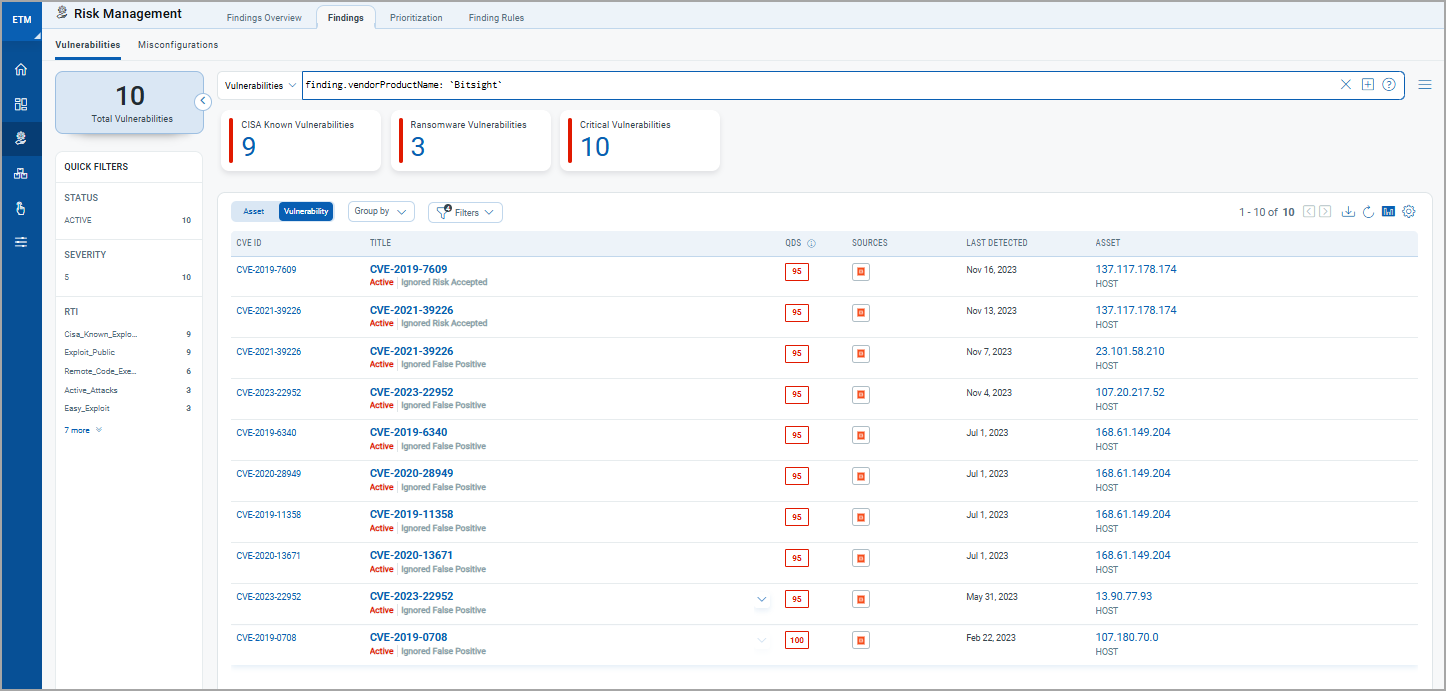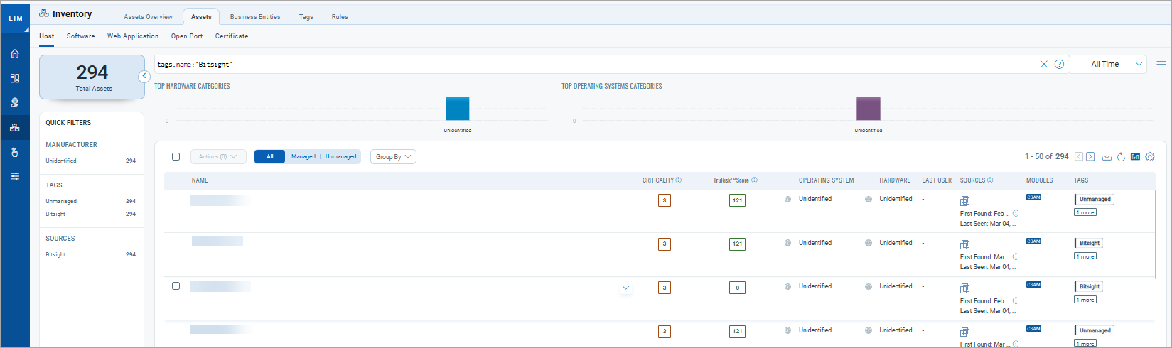 By default, Bitsight masks the IP addresses of its assets for security reasons. When the connector ingests assets as Masked IPs, there is a greater chance of asset duplication in the ETM inventory since the masked assets lack a unique identifier.