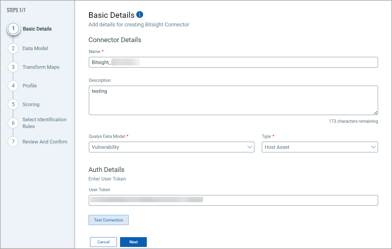 User Token: Enter the BitSight user token created by following the steps in the Prerequisites section for authentication. - Click Test Connection and once succesful, click Next to proceed.