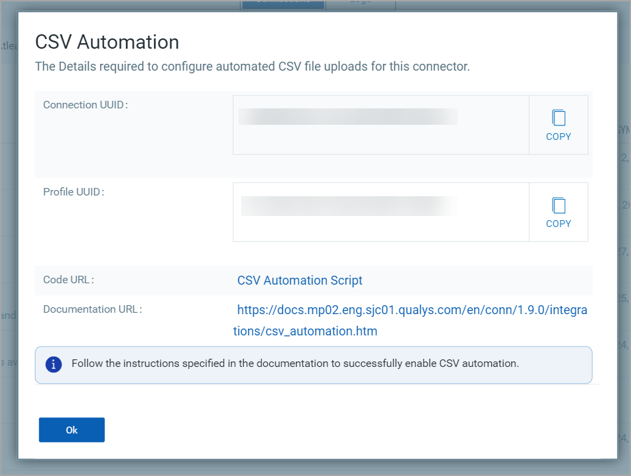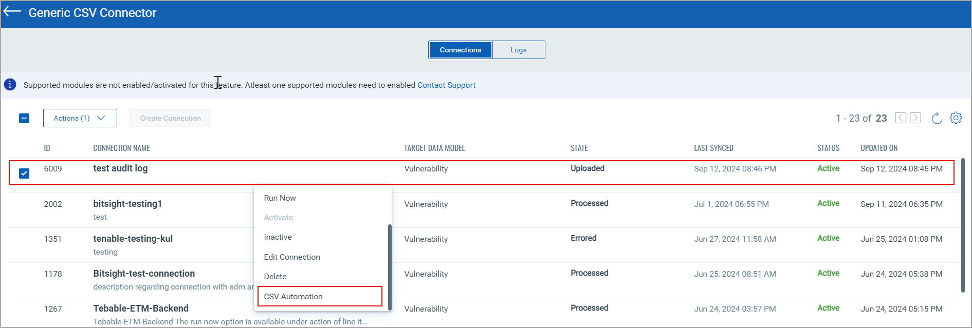 Your selected connector can now upload new CSV files automatically to run the connection and fetch findings.