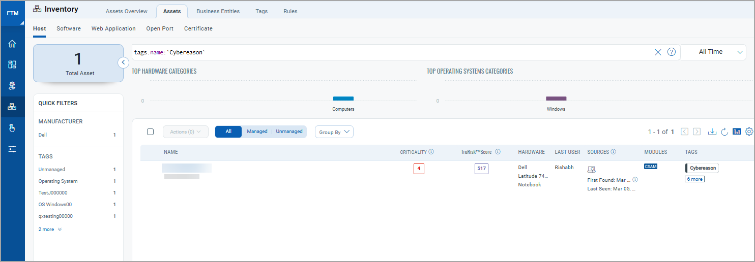 You can view the assets imported from the CyberReason connection by navigating to the Inventory tab of ETM.