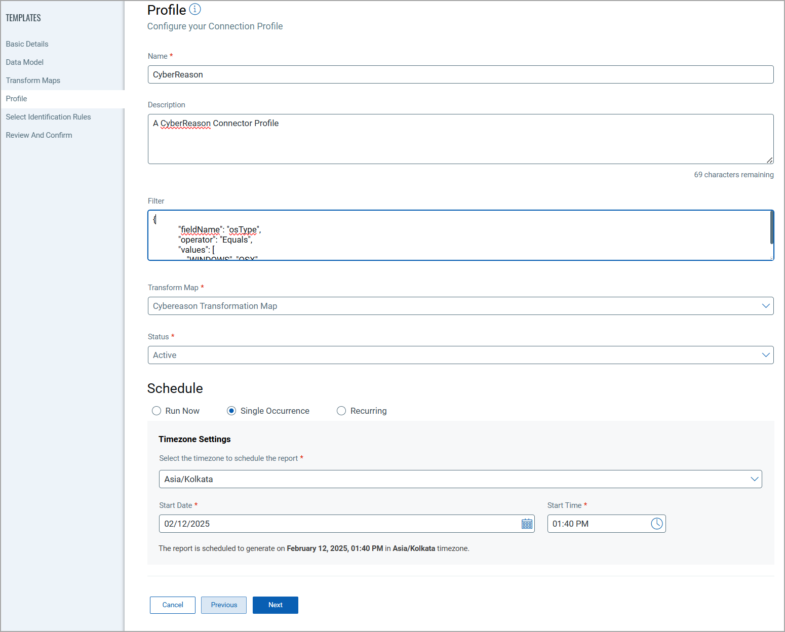 Create a profile for your connector. A profile decides the connector status, execution schedule and transform map to choose. The connector follows the configurations of this profile for all future executions.