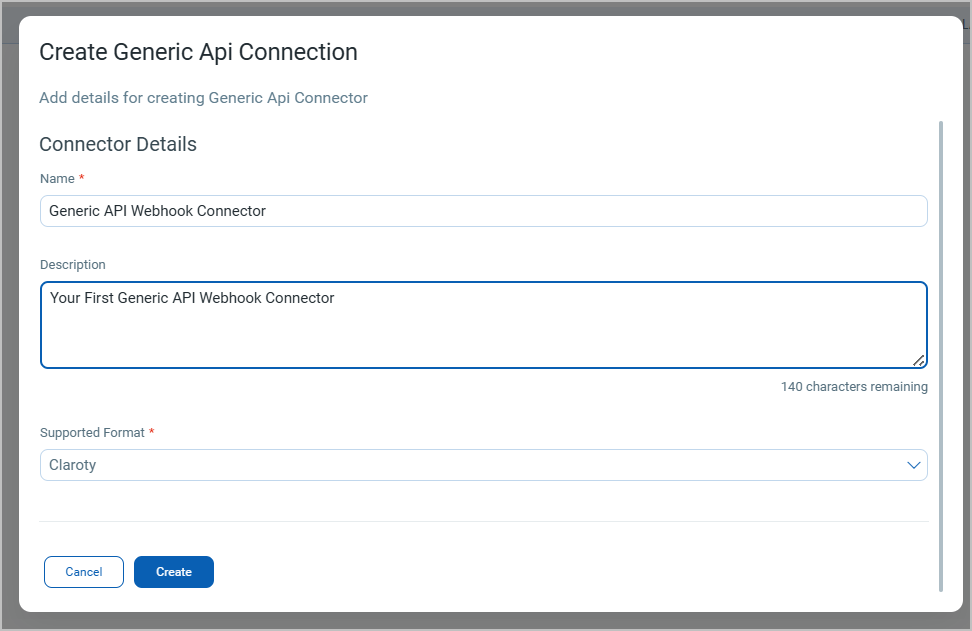- Create a new connector and select the supported format. You can find the previously registered integration name in the dropdown (refer to Register Vendor Integration Name).