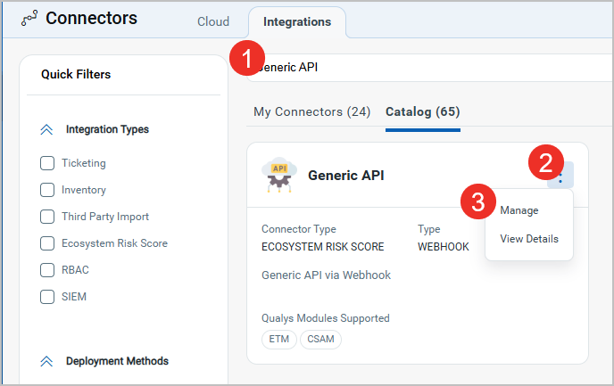 To ingest data in Qualys ETM using the Webhook Connector, you must first create a connector in the Qualys user interface.