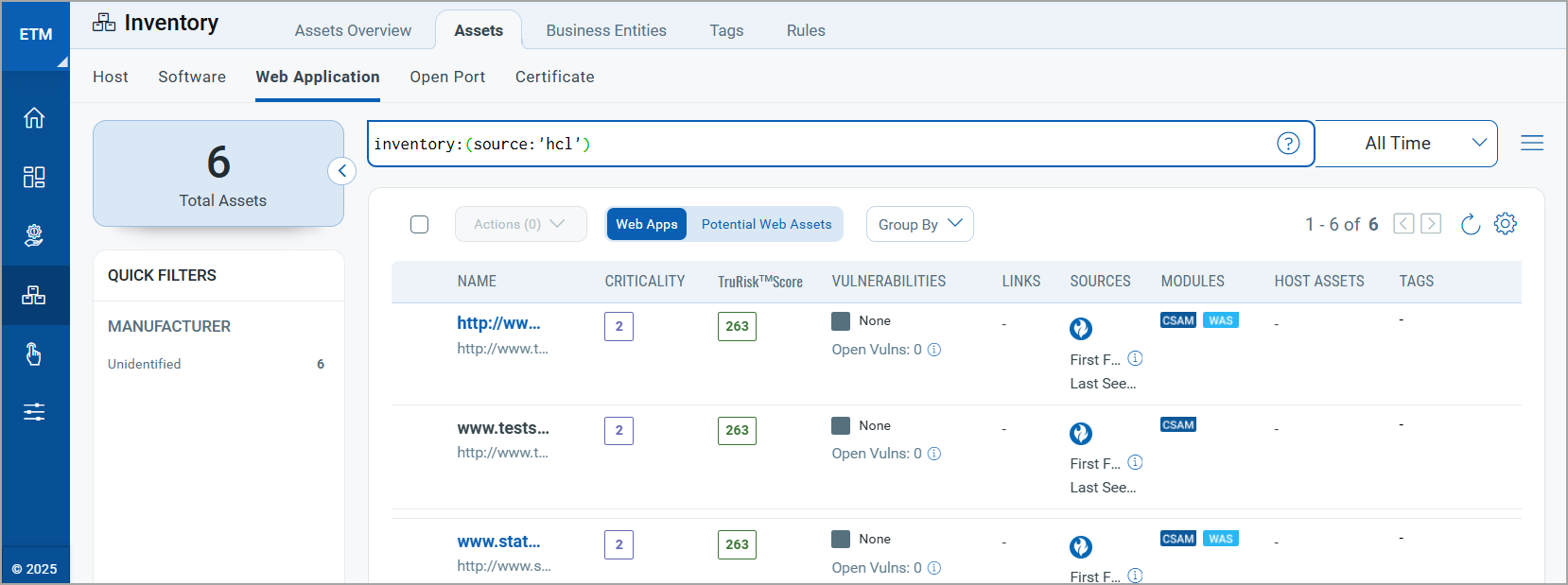 You can view the assets imported from the HCL AppScan connection by navigating to the Inventory tab in ETM.