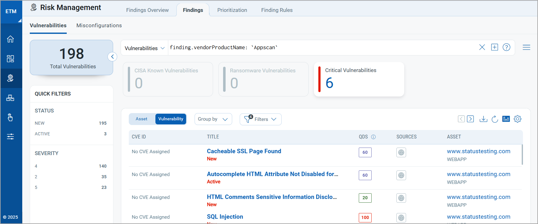 The imported vulnerability findings from HCL AppScan provide rich context and integrate seamlessly with Qualys' native TruRisk scoring system. Use these findings in Qualys ETM to enhance your risk prioritization workflows and make informed security decisions.