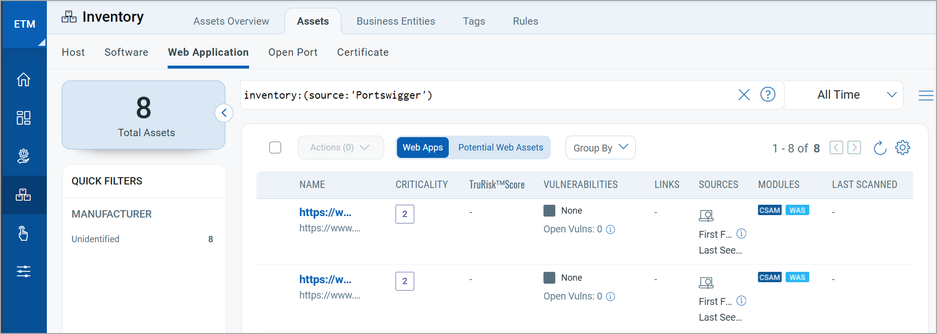 All applications synced from Burp Suite appear under Web Application assets in ETM, CSAM, and WAS (if subscribed). These entries are initially inactive in WAS.