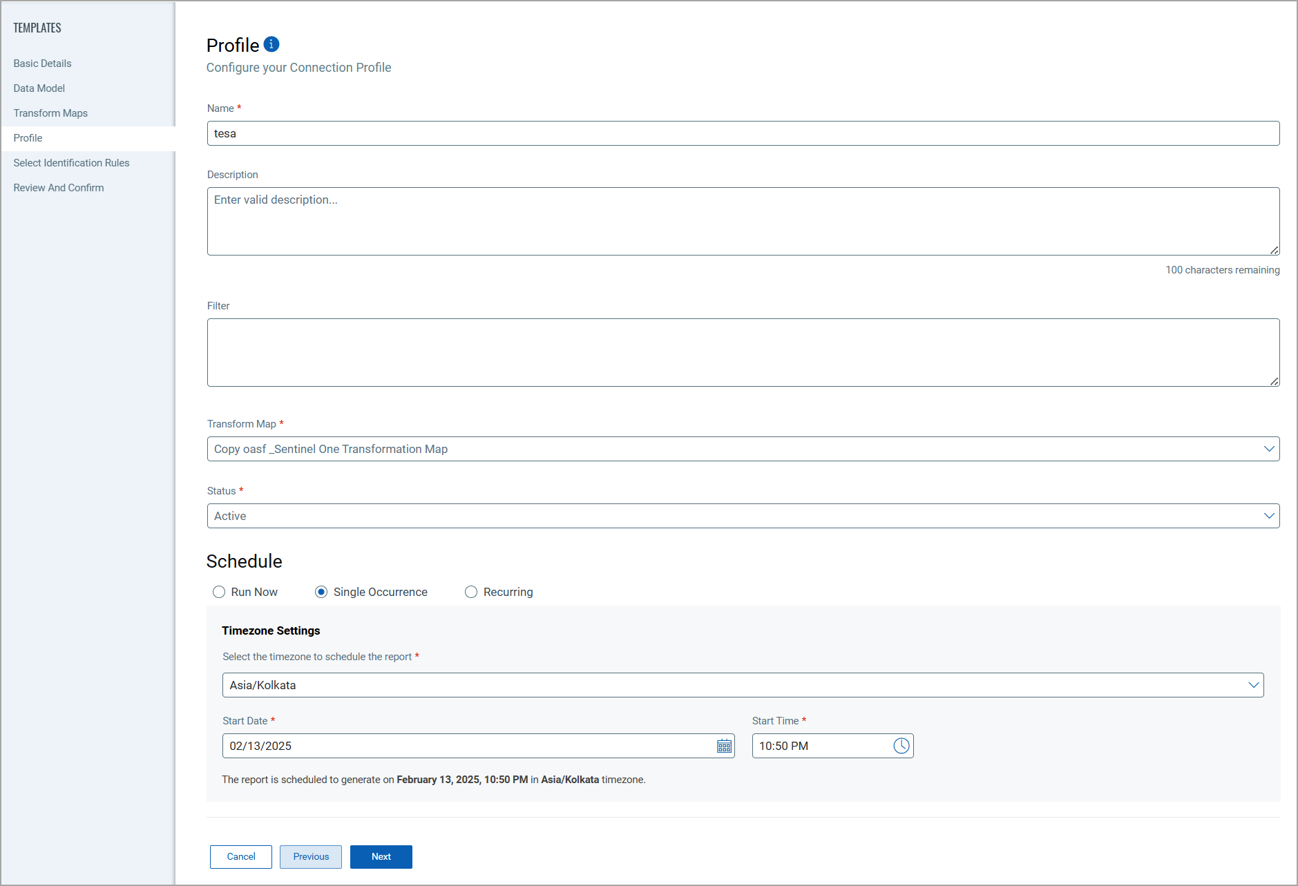 Create a profile for your connector. A profile decides the connector status, execution schedule and transform map to choose. The connector follows the configurations of this profile for all future executions.