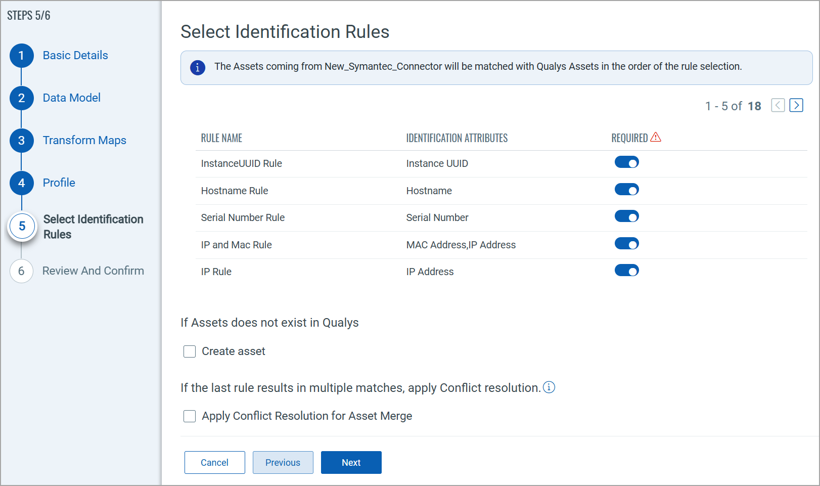 The Identification Rules are a set of out-of-the-box precedence rules set by Qualys CSAM. The connector discovers findings based on the order set by the selected Identification Rules.