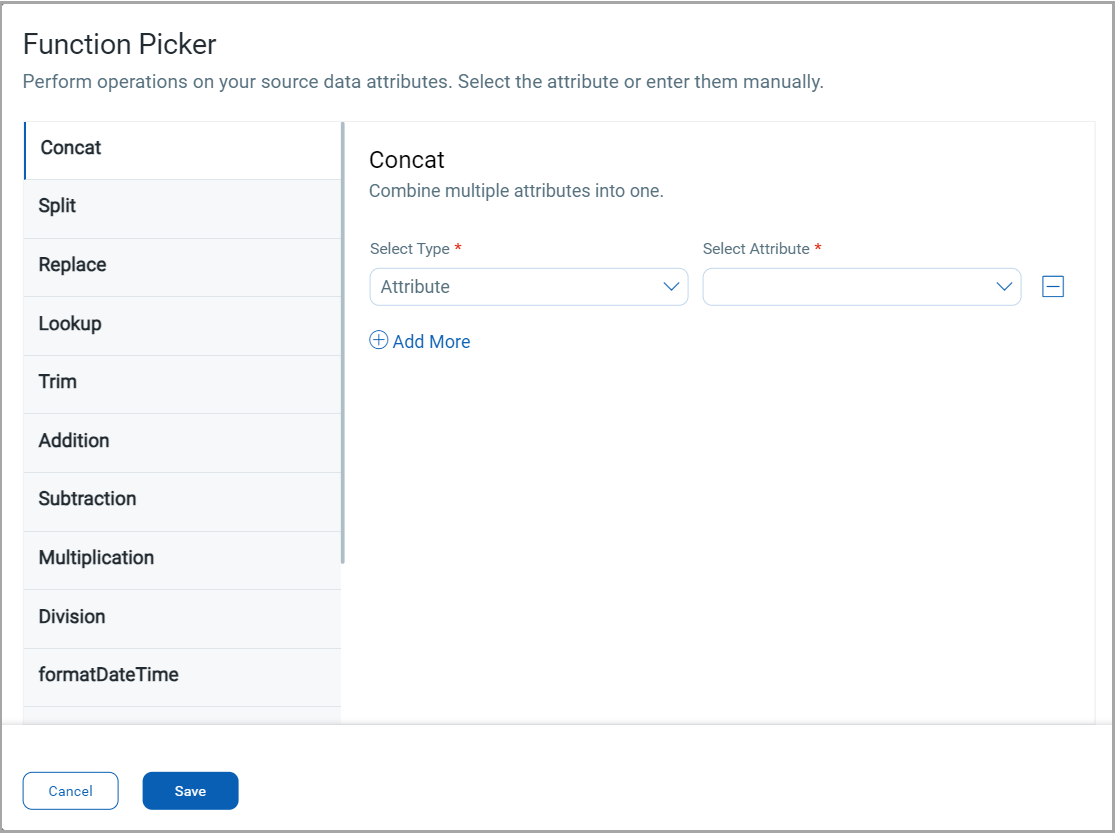 The Function Picker is a collection of powerful operations for your data model transformation. Select and apply these data transformation operations while mapping data from your vulnerability assessment vendors to the Qualys ETM. For example, you can combine multiple text strings using Concat, convert date formats using formatDateTime, or manipulate text case using toUpperCase/toLowerCase functions.