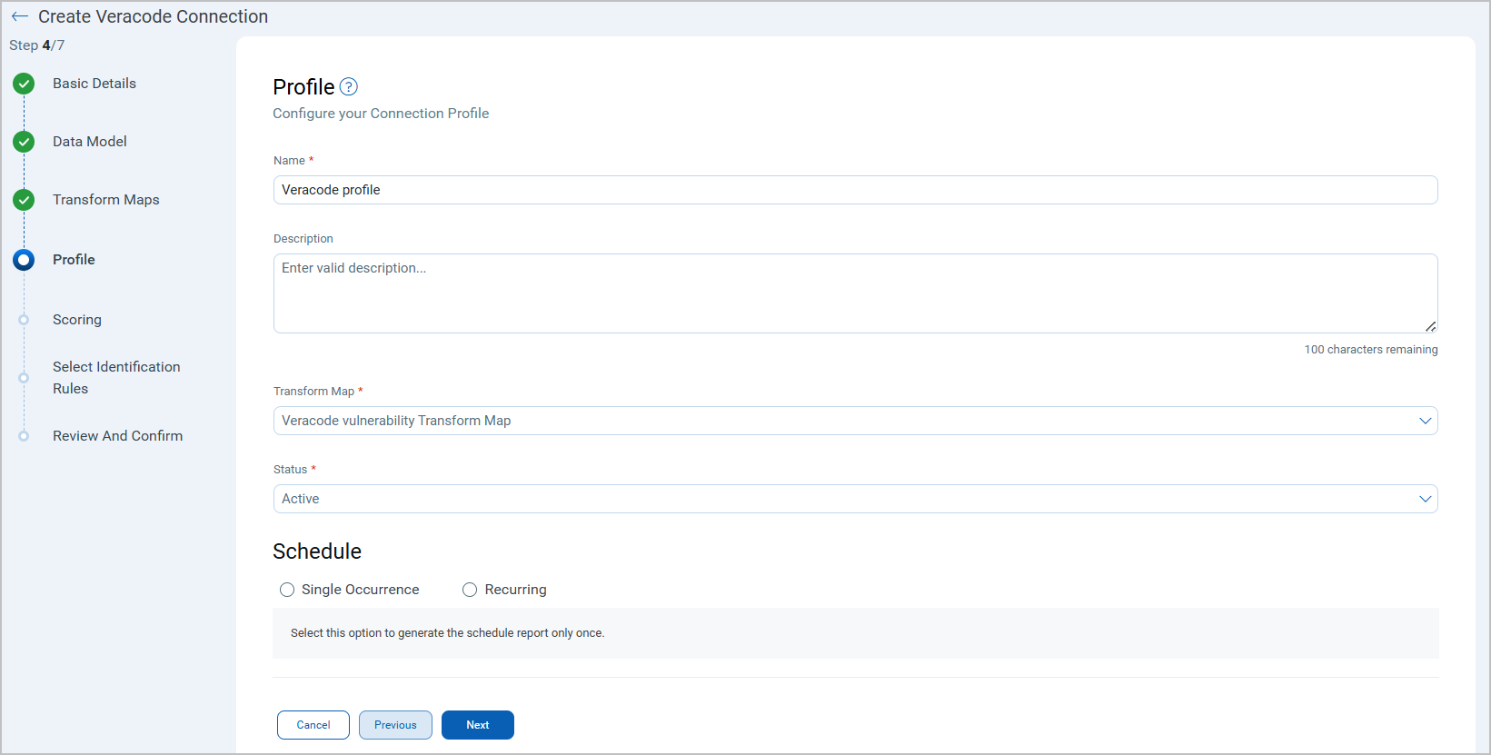 Create a profile with Name, Description, Transform Map, Status, and Schedule.