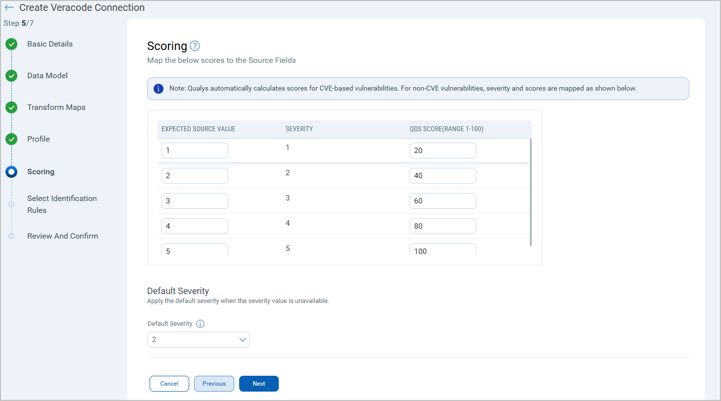Map vendor non-CVE scores to QDS 0–100; set Default Severity for unmatched values.