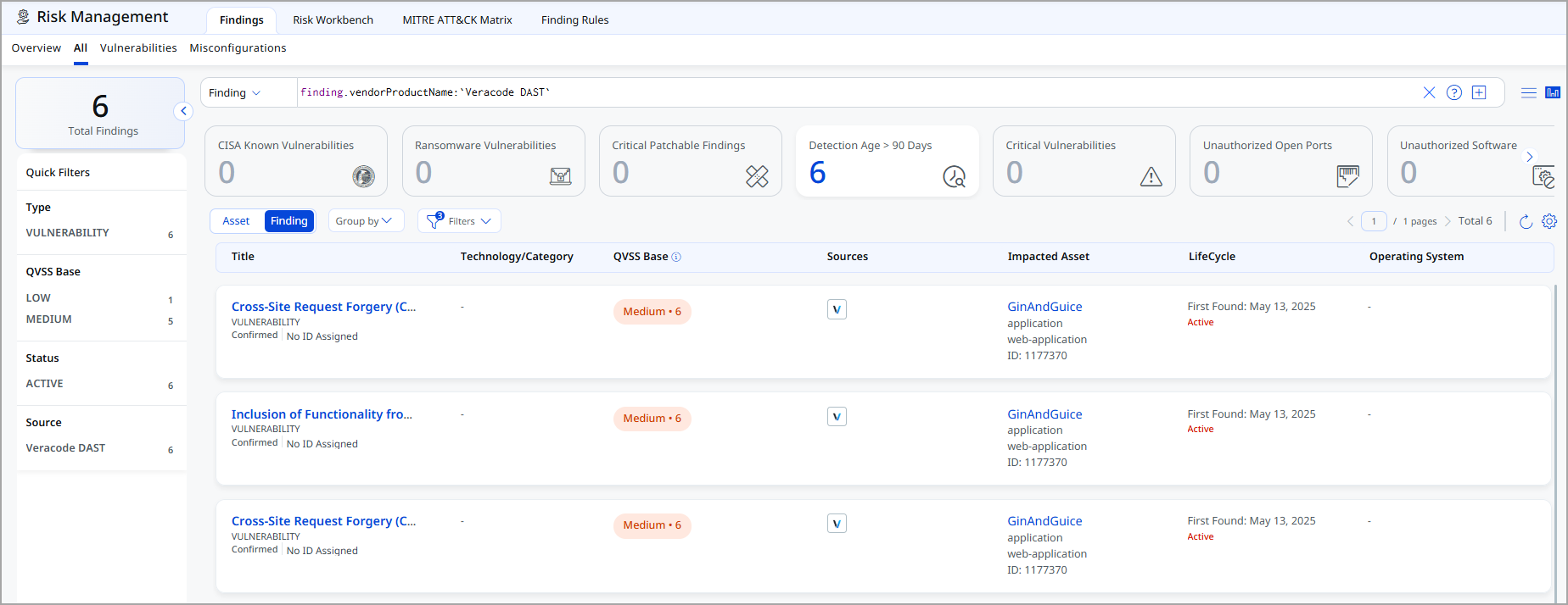 Go to Findings > Vulnerability - Use filter: finding.vendorProductName:"Veracode" to list Veracode findings.