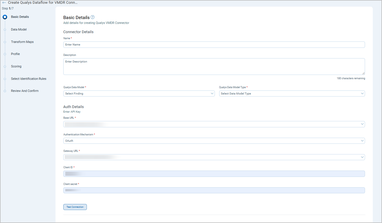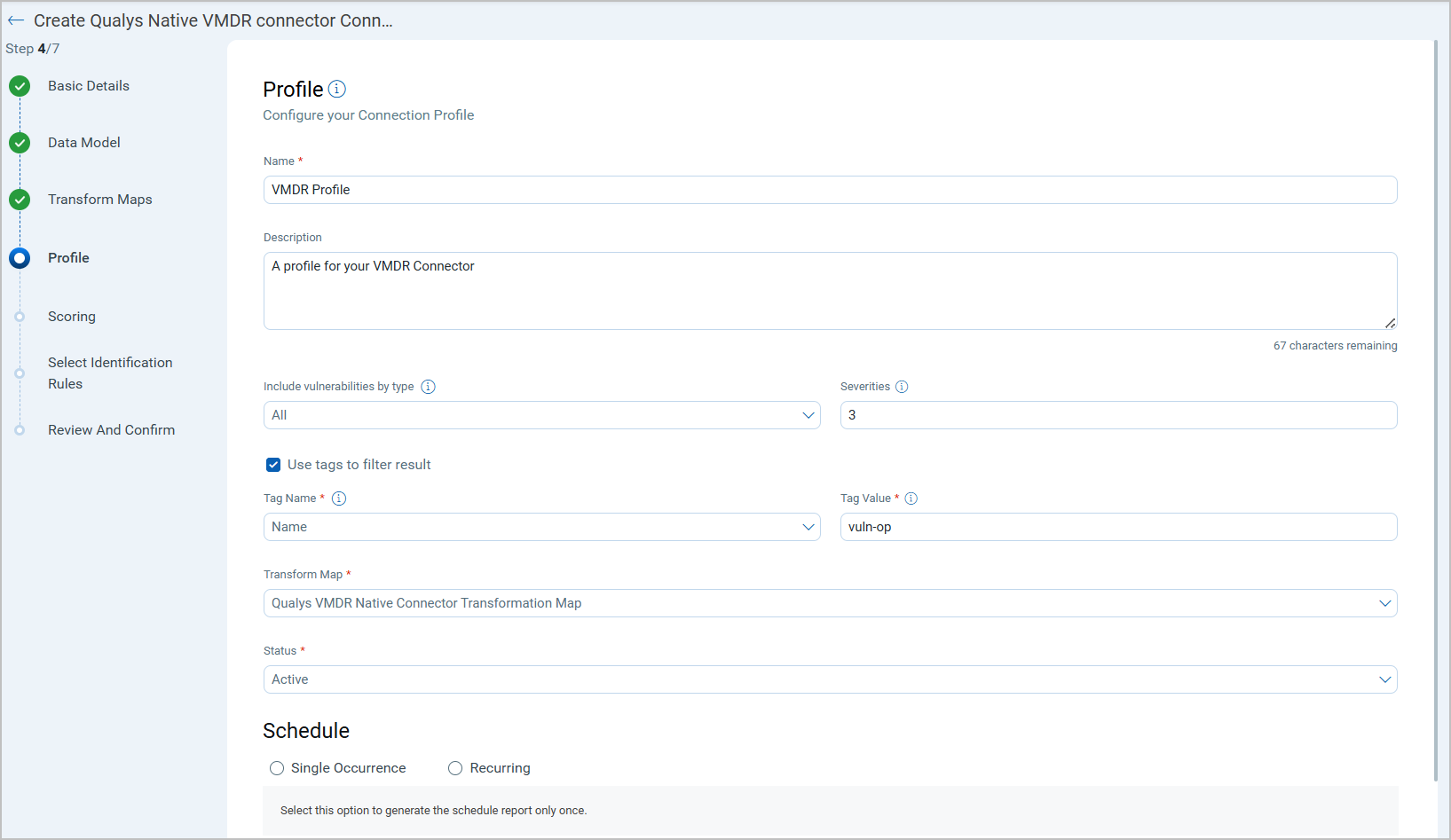 A Connection usually involves creating a profile that defines which asset to import based on detection data types and asset types. The connector then automatically executes according to the schedule (or on-demand), pulling asset data from VMDR into ETM where it can be viewed alongside other security findings.