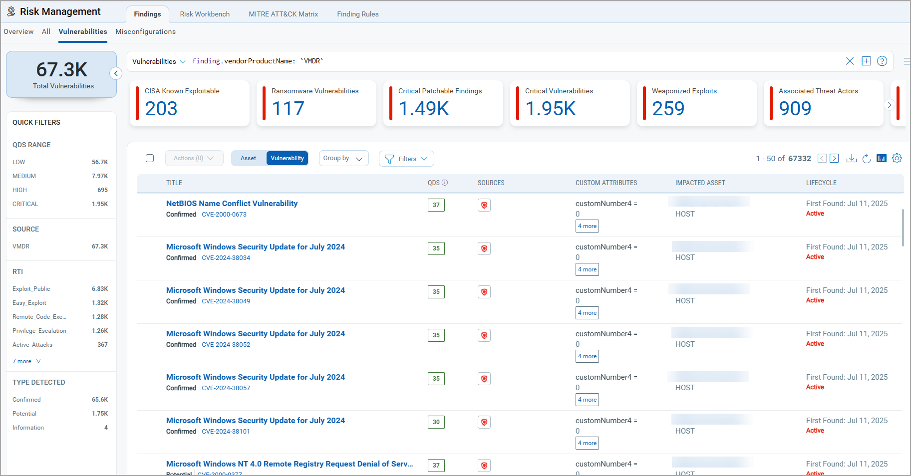 Use the token, finding.vendorProductName: `VMDR` to view all the discovered VMDR vulnerabilities.